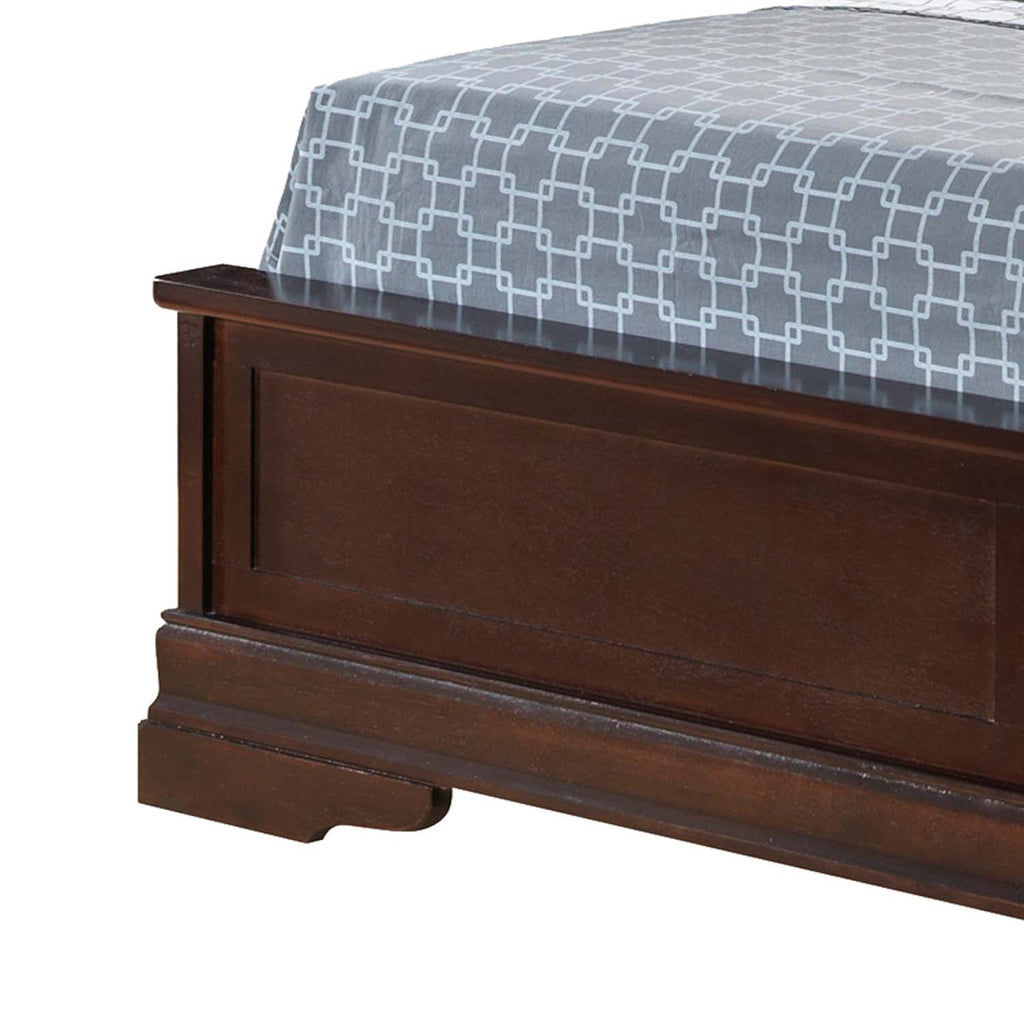 This elegant sleigh bed brings a warm, traditional charm to your bedroom with its rich wood finish and gently curved headboard and footboard. The smooth, paneled design highlights the craftsmanship, offering a clean and timeless look that works beautifully in both classic and transitional spaces. The graceful curvature adds a refined silhouette without overpowering the room, while the sturdy frame provides dependable support for nightly comfort. Its warm tones help create a cozy and inviting environment, making it an excellent choice for master bedrooms or guest rooms where style and relaxation are equally important. Pair it with neutral bedding for a soft, serene aesthetic or bold patterns to create a striking focal point. This bed delivers lasting beauty with a sophisticated, understated presence.