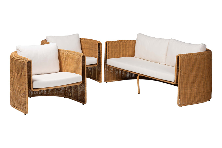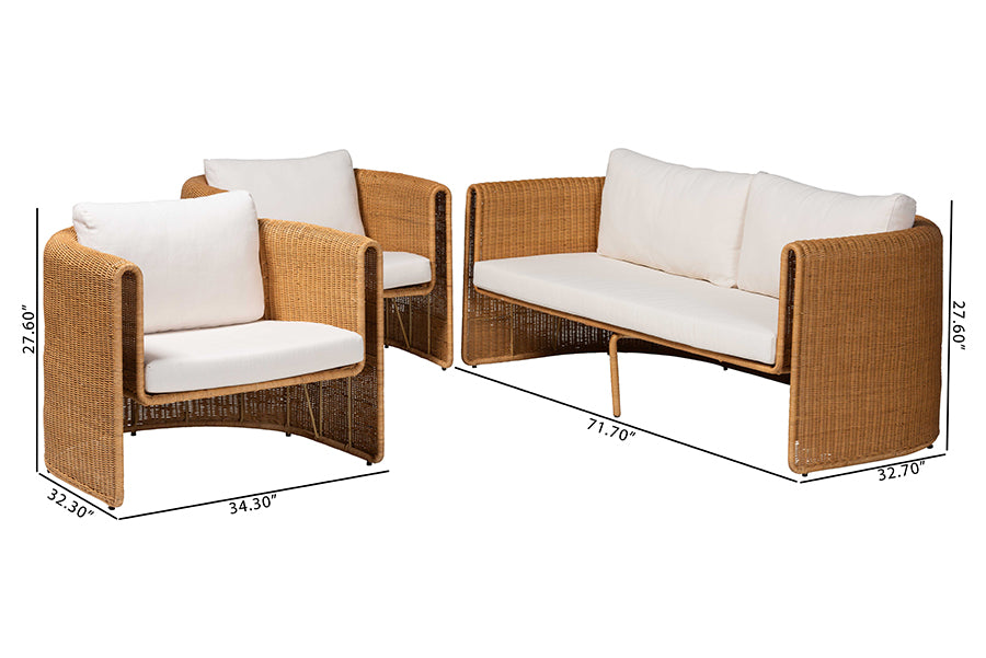 Rustic craftsmanship meets bold geometry with the Katrina living room set. Made in Indonesia, this bohemian set includes one sofa and two armchairs handcrafted from sustainably sourced natural rattan. Each piece features a classic barrel silhouette with smooth, rounded edges with cozy armrests to encourage casual relaxation. The Katrina will arrive fully assembled and is fitted with removable cushions padded with plush foam and upholstered in sumptuous fabric. Employing a unique exotic take on classic design, the Katrina living room set is a notably tranquil arrangement.