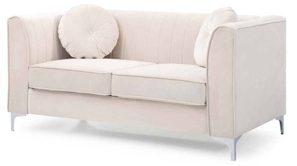 Soft Velvet Channel Tufted on the Inside of the Arms and Backs. Pocketed Coil Cushion Seats Make this Set Comfortable and Stylish. Chrome Nailhead trimmed and finished off with Chrome Plated Legs , It also includes Round Matching Throw Pillows. KD Design allows for easy Delivery to any Home or Room! Choose from Sofa. Loveseat Chair Or Reversible Chaise Sectional