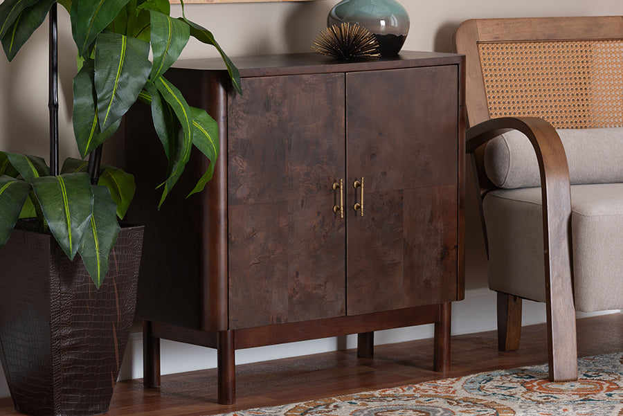 Enchanting modern design takes inspiration from the natural world with the lovely Latnia storage cabinet. Crafted in Indonesia, this modern piece consists of natural burl wood. The doors open to reveal two spacious shelves ideal for organizing busy rooms while reserving the tabletop as a fantastic display area. The Latnia will arrive fully assembled and showcases the rich knots and rolling grain unique to burl wood, resulting in not two pieces being exactly alike. Beautifully designed brass door handles highlight the graceful poise of the piece, making the Latnia storage cabinet an enthralling fixture of any setting.