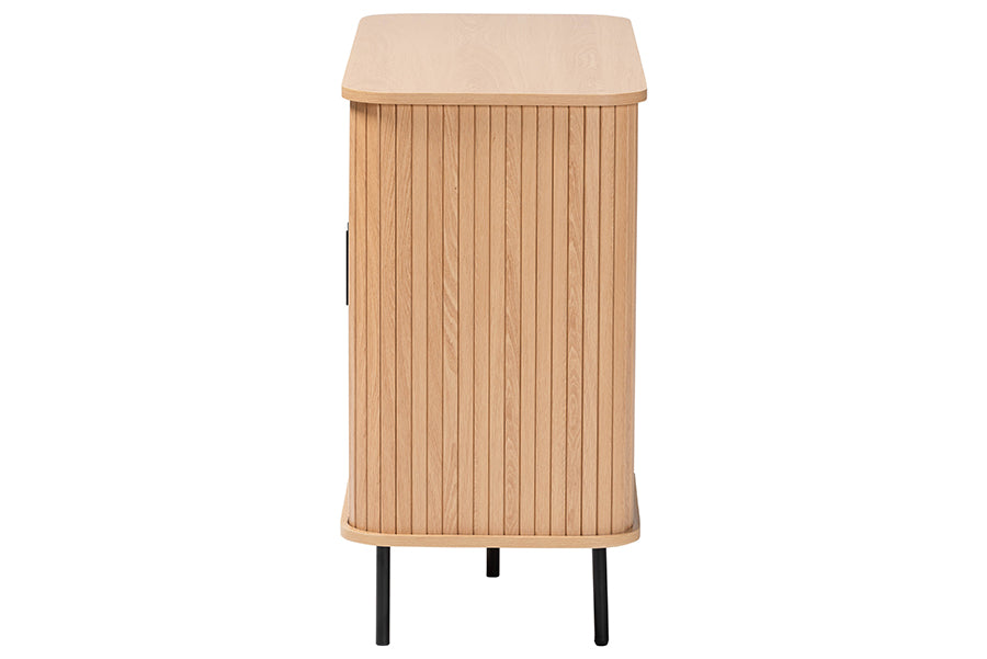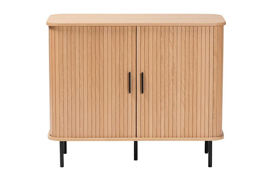 The beauty and functionality of mid-century design arrives in the form of the Dominic storage cabinet. Adeptly crafted in China, this classic design is comprised of sturdy wood embellished with metal handles for an added touch of sleek industrial flair. Its oval tabletop serves as a fantastic display area while the sliding tambour doors open effortlessly to reveal four shelves perfect for organizing and decluttering busy areas of your home. The Dominic requires assembly and features a fluted wood exterior for a textured display rich with artistic presence. Minimalist metal legs complete the look, making the Dominic storage cabinet a fantastic addition to any layout.