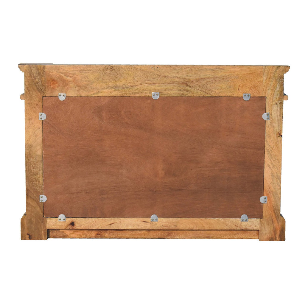 Embrace the essence of Peking art with the Oriental Elegance Wine Cabinet. Crafted from solid mango wood, this table features a hand-painted black base adorned with hand sketched oriental characters, each telling a unique story. The design is highlighted by a plinth bottom, adding an elegant flow. A shiny brass knob complements the piece, ensuring functionality meets style. This nightstand table is a perfect blend of durability, artistic charm, and Chinese cultural influence.