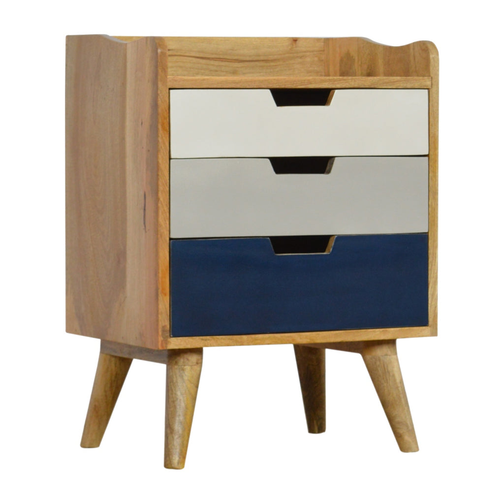 This Nordic gradient nightstand table is the perfect stand for any bits and pieces you wish to keep nearby before bedtime. It features ample space for a lamp, photo frame or any ornaments. It has been constructed from 100% solid mango wood with a fine oak-ish finish body and 3 hand painted cut-out drawers in white, grey and navy. Some other characteristics include 4 Nordic style legs and cut out slots for easy access to the drawers. A lovely pop of colour and addition to the home.