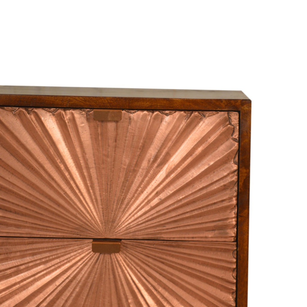 This Manila Copper Chestnut nightstand Table was designed to add a touch of elegance and charm to your bedroom, featuring copper inlay plated drawers and Nordic-style cap feet, this piece has been constructed from 100% solid mango wood and offers a rich chestnut finish and pull-out handles along with surface space to uplift your bedroom look.