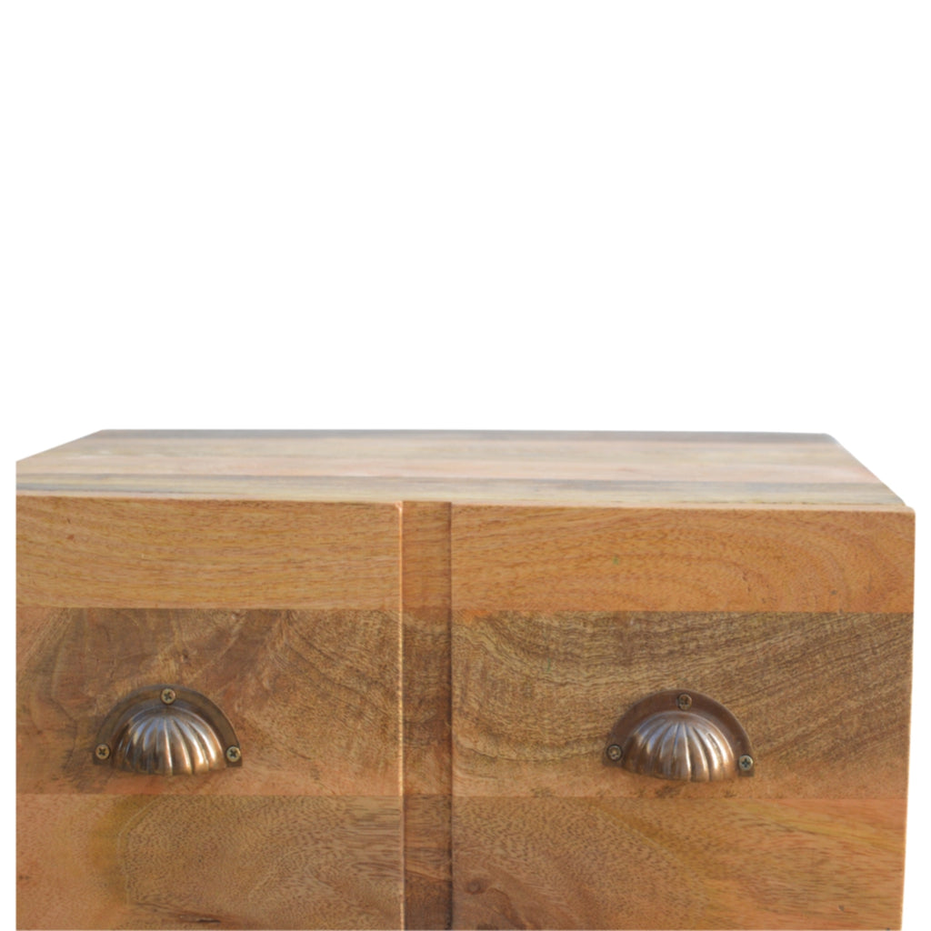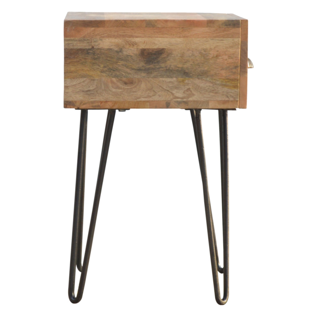 This solid wood industrial design nightstand is a fabulous addition to your home adding a more modern feel your bedroom. It is constructed from 100% solid mango wood and the base/legs are constructed from 100% metal Iron. Useful storage space is available with 1 drawer and a decent sized top to place a lamp, books etc. Other features include a smooth oak-ish finish on the wood, triangular metal legs which have a pewter finish and are knock down but very easy to assemble, the drawers also come with 2 shell handles which are.