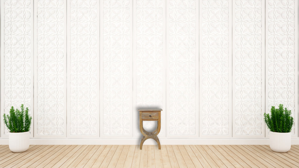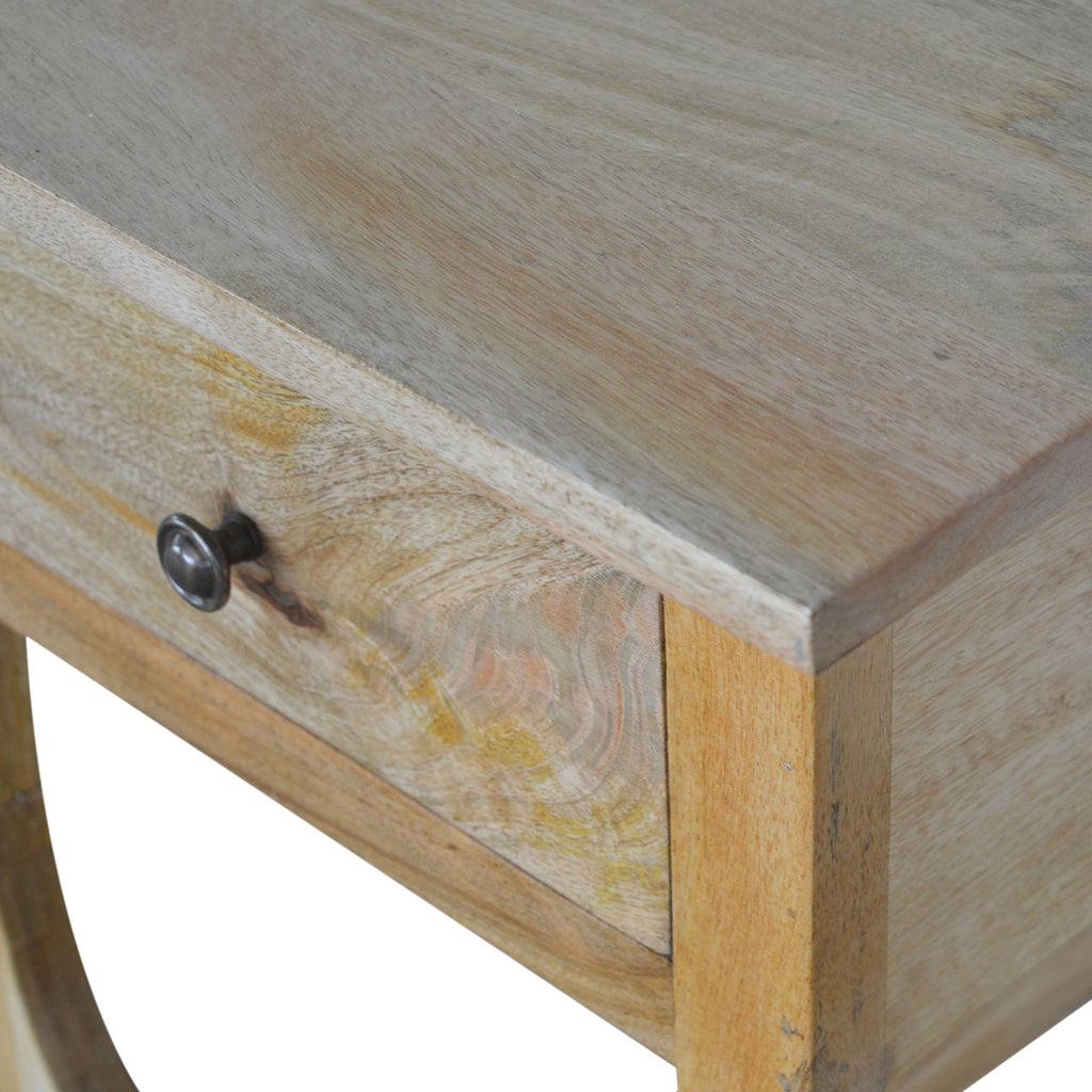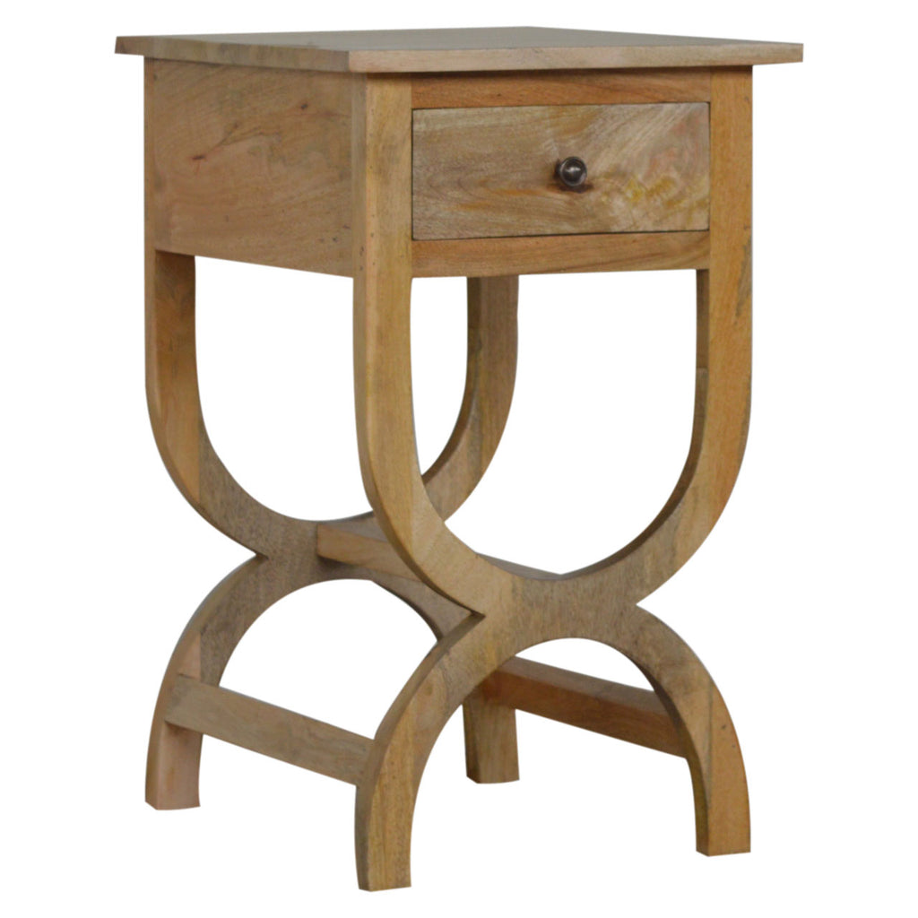 This nightstand or end table has been constructed from 100% solid mango wood in an oak-ish finish. Some features of this include classic serpentine feet with a strong undercarriage support which give extra character to the piece. It has one handy drawer which has a shiny knob and is the perfect addition to any bedroom and home.