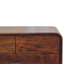 A perfect blend of mid-century design and everyday functionality, this nightstand is handcrafted from 100% Solid Mango Wood in a rich chestnut finish. Featuring a gracefully curved structure, it includes three compact drawers adorned with brass knobs and a sleek brass handle, offering convenient storage for your essentials. The tapered Nordic-style legs add a touch of elegance, making it a versatile addition to any bedroom or living space. Durable, sustainable, and stylish, this timeless piece effortlessly enhances your home with its refined craftsmanship and practical design.