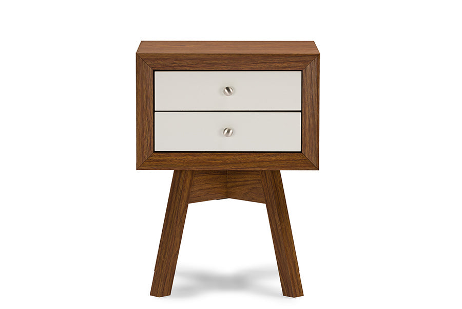 Iseline is a small-sized end table packed with modern details: two drawers, beveled edges, a showstopper of a base, and an overall mid-century modern aesthetic. Two-tone in walnut and white faux wood grain paper veneer finishes off the engineered wood frame. Non-marking feet and silvertone knobs complete the look. Made in Malaysia, this designer end table also serves as a stellar modern nightstand. Assembly is required. To clean, dust with a dry cloth.