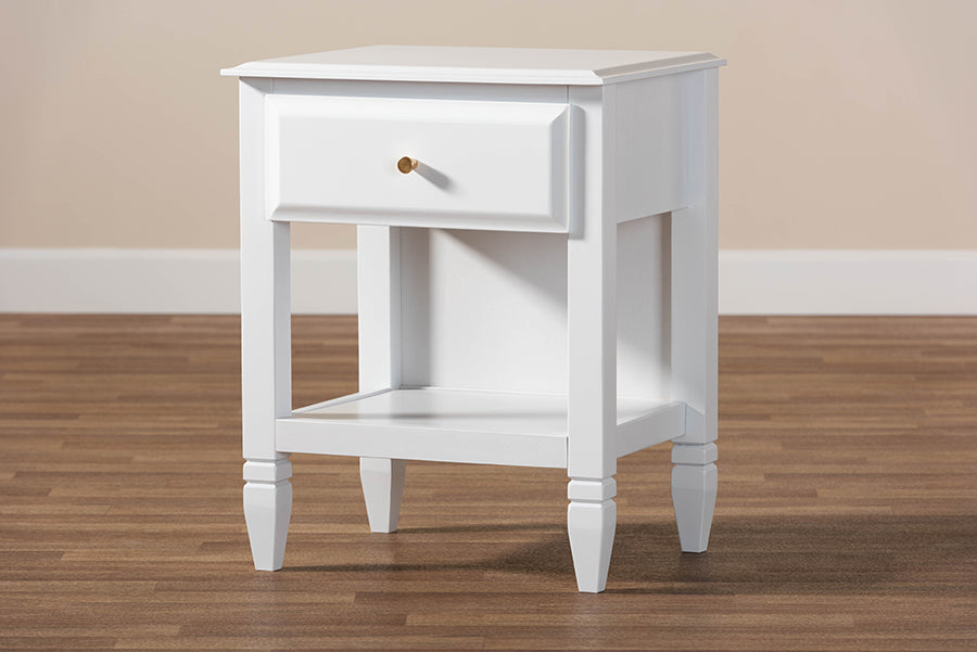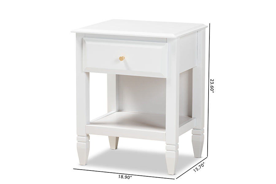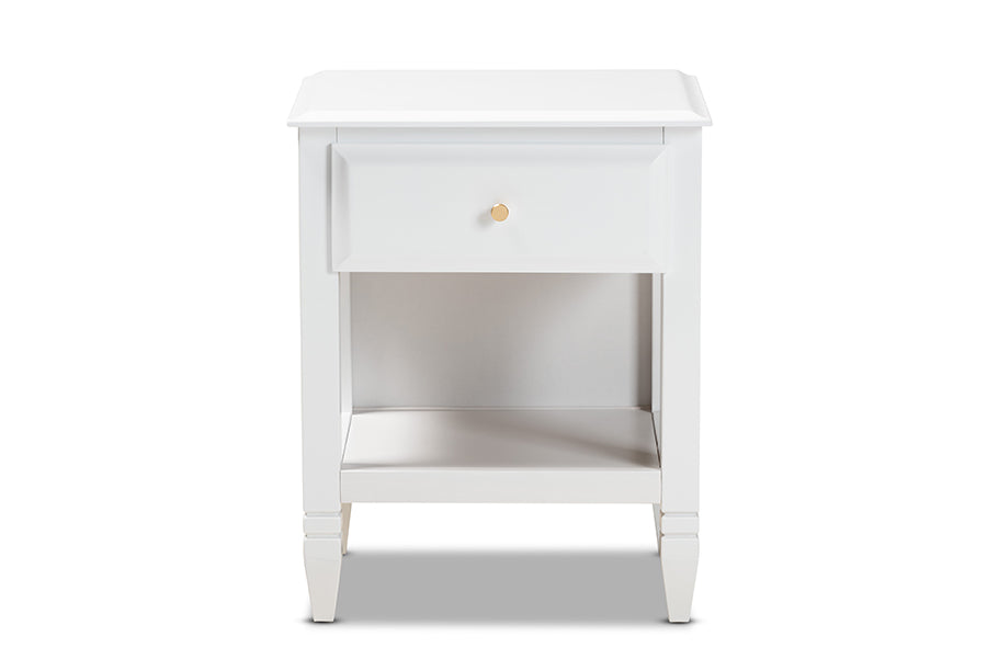 A classic silhouette receives a glamorous update in the Lea nightstand. Made in Malaysia, this wooden nightstand displays a polished white finish that brightens any space. The tabletop is well suited for a lamp and trinkets, while one drawer and one shelf provide storage space for bedside essentials. A striking gold-tone knob adds a touch of glamour. Inspired by traditional design, the Lea features tapered feet with recessed detailing. Requiring assembly, the Lea nightstand strikes the optimal balance between classic and contemporary for a look that enhances any bedroom.