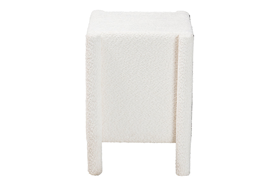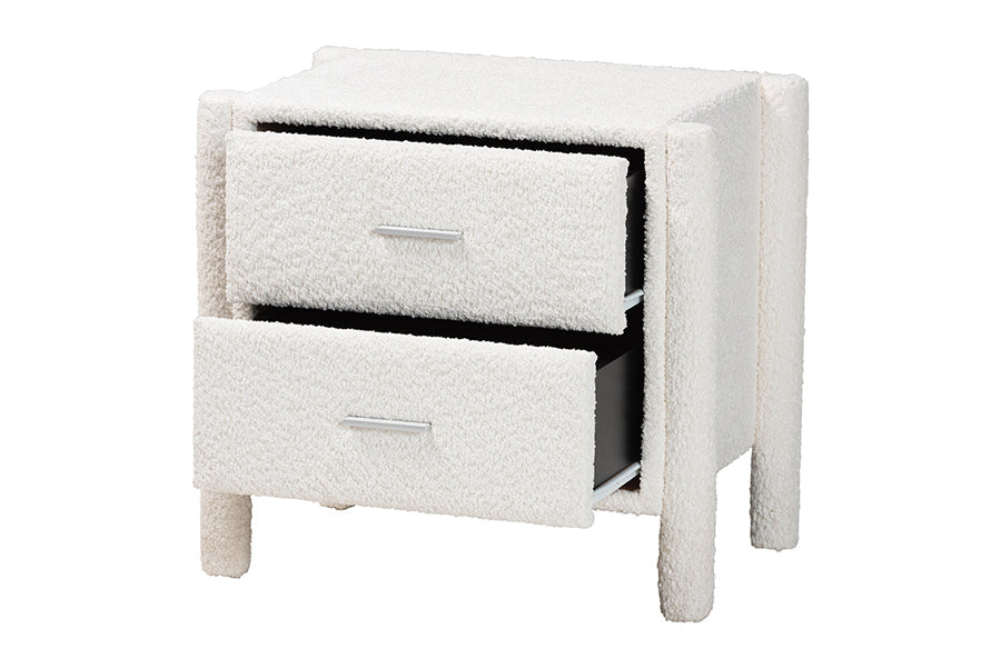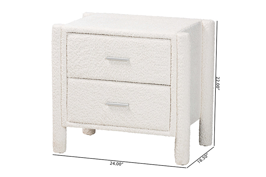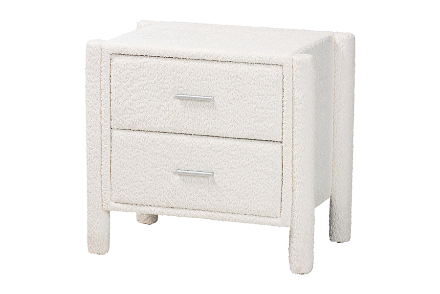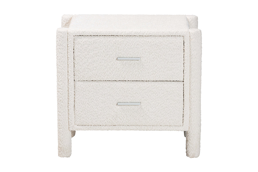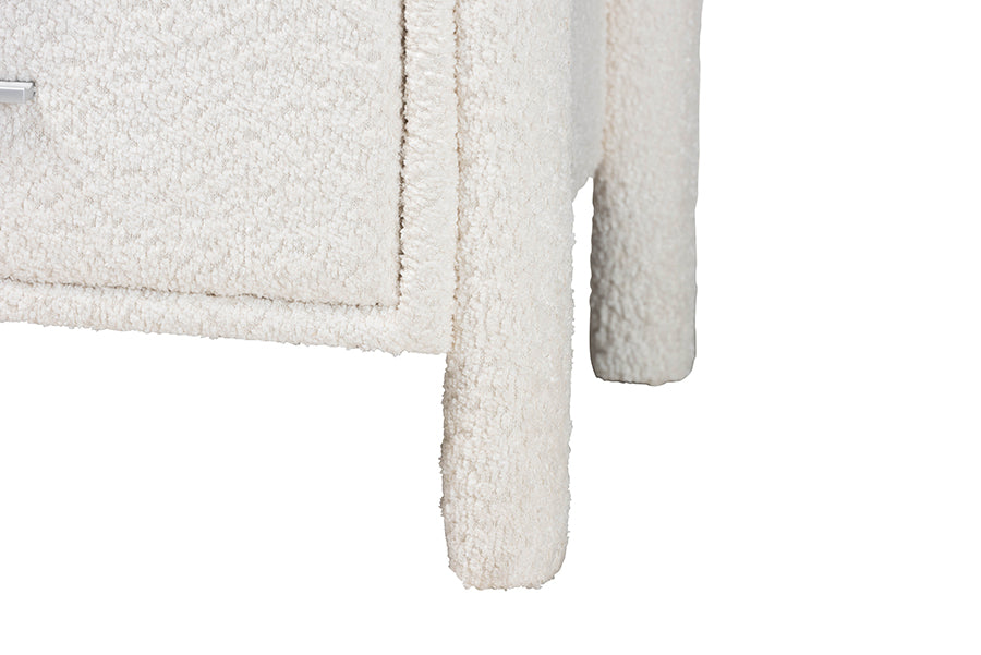 Develop an environment of chic serenity in your space with the delightful Lilly nightstand. Made in Malaysia, this contemporary piece consists of a sturdy wood frame padded with plush layers of foam and upholstered in lavishly soft teddy-bear fabric. Two drawers provide storage for all your bedside essentials while reserving the tabletop for nightly use. The Lilly requires assembly and features beautifully rounded posts that outline the piece with smooth geometric charm. Emblematic of modern sophistication, the Lilly nightstand beautifully accents any bedroom.