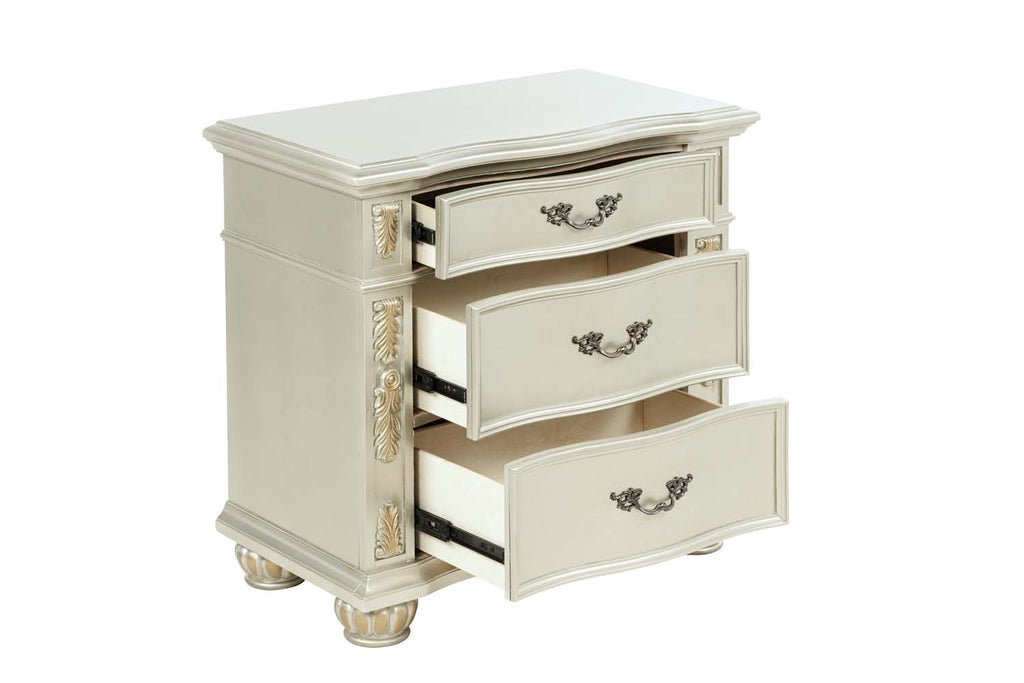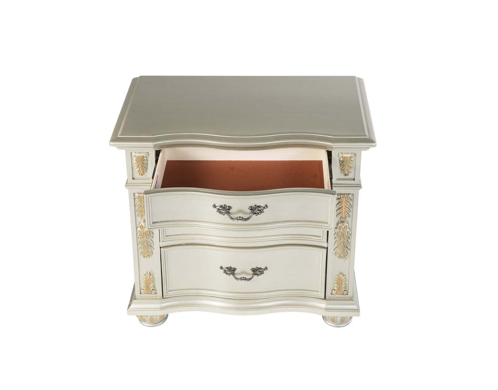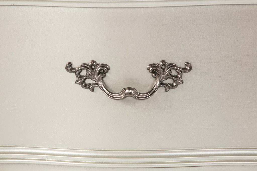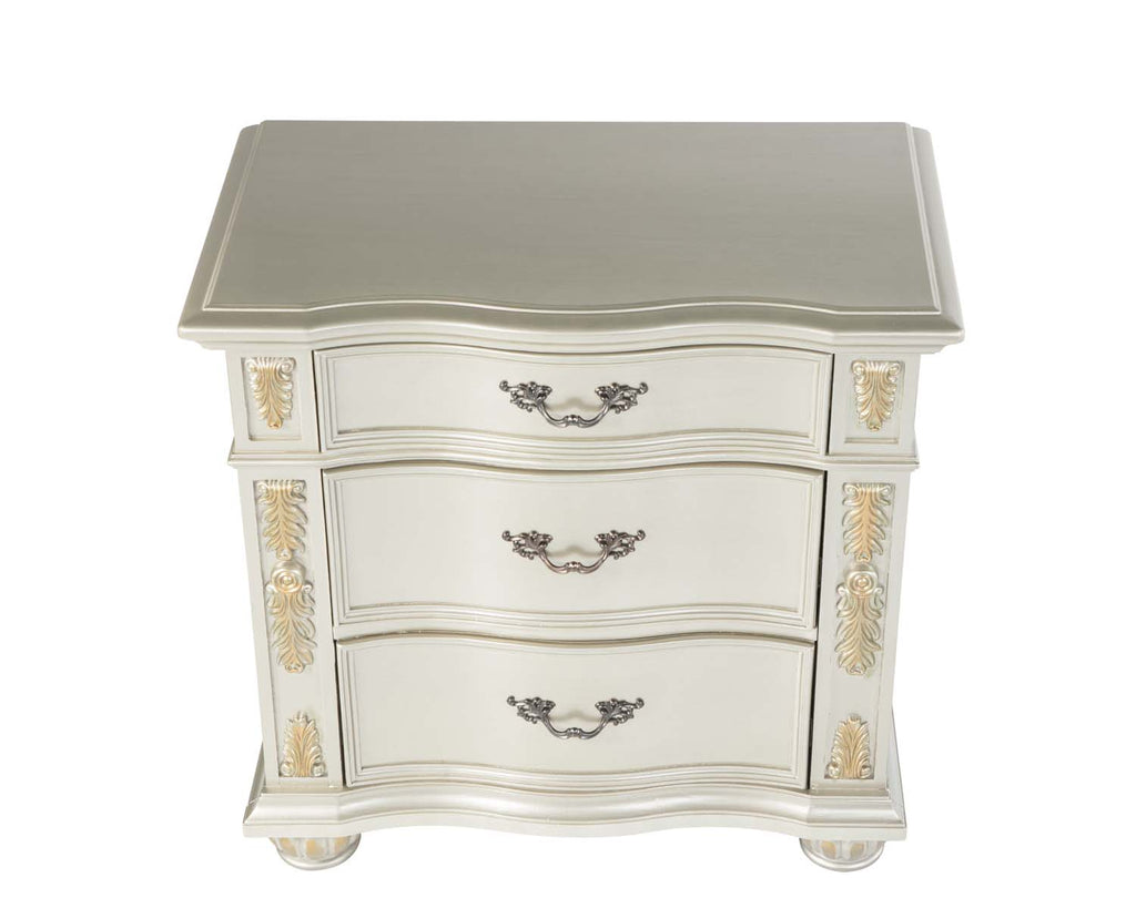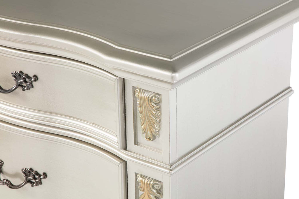 Real wood Veneers are Layered on Top of Oversize Cases. Drawer Fronts Feature Deep Grain Wood Panels Surrounded by Gold Hand Painted Accents. Smooth Drawer Operation with Side Mounted Ball Bearing Drawers that include Velvet Lining on the Top Drawer.