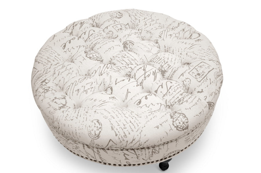 With sumptuous button tufting and black turned wood legs, the Jeane Upholstered Ottoman instantly augments the elegance of your interior. This stunning modern ottoman is made in China with durable eucalyptus wood for its frame, firm foam cushioning, and beige linen upholstery with a fanciful French script print. Antiqued brass upholstery tacks line the sides. The Jeane Round Ottoman requires minor assembly and should be spot cleaned as needed. This style is also available in solid colors: either dark gray or beige (each sold separately).