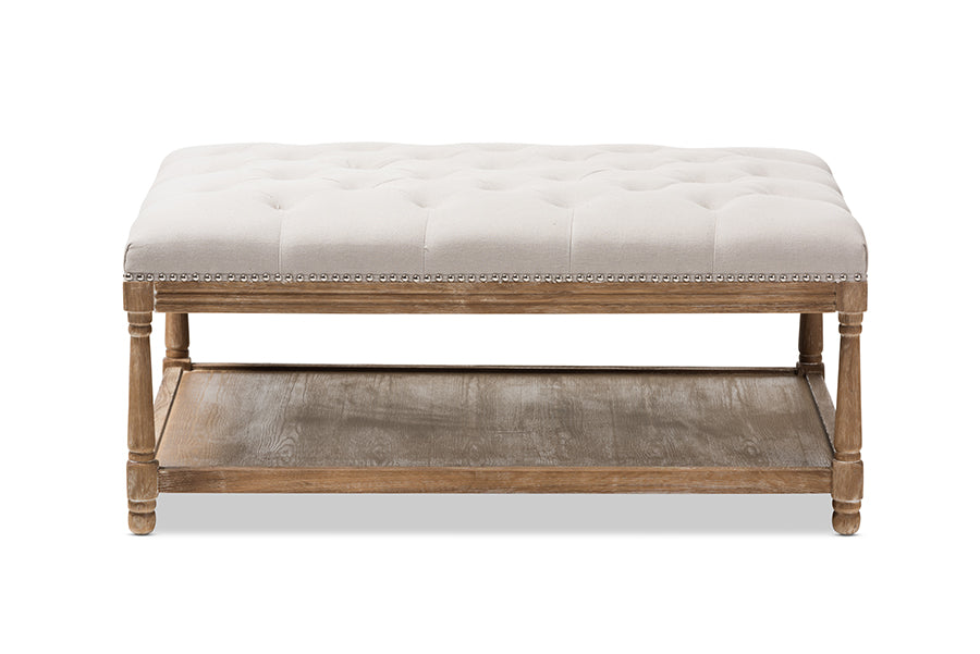 Like any good classic, the Larissa effortlessly teams style with functionality while proving its versatility as a footstool and coffee table with storage unit. Inspired by French Provincial design, the Larissa features intricate tufted detailing and carved woodwork. The coffee table ottoman is as practical as it is pretty, featuring a plush comfortable seat with buttons and lower shelf for storage. Silver nail heads detailing gives the piece a contemporary appeal while a medium density foam filling ensures ultimate comfort. Ideal as a footstool or coffee table, the Larissa is built with a solid oak frame. The weathered finishing adds a rustic touch and completes the look. Made in China, the Larissa will arrive fully assembled.