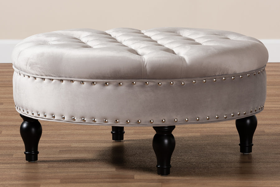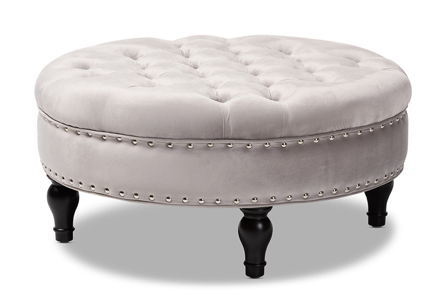 Give your space an elegant upgrade with the Jeane ottoman. Constructed from eucalyptus wood, this chic ottoman is upholstered in rich velvet upholstery that is soft to the touch. The stunning sheen of the velvet is highlighted by button tufting on top, which adds a refined touch. A fusion of both modern and traditional design elements, the Jeane features antique brass studs and black turned, fluted wood legs. The Jeane ottoman is made in China and will requires leg assembly.