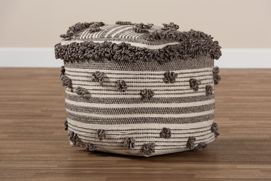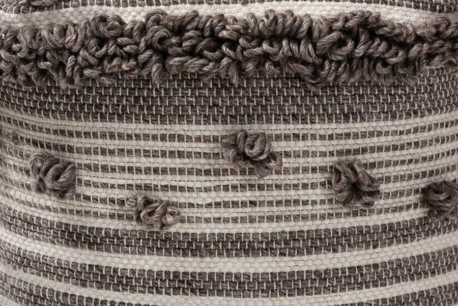 Add a cozy, bohemian touch to any space with the Larkin pouf. Handwoven from wool, the Larkin features a chic brown and ivory striped pattern. Knot embellishments add a playful look. This versatile piece can be used as a seat, footstool, or casual coffee table. Made in India.