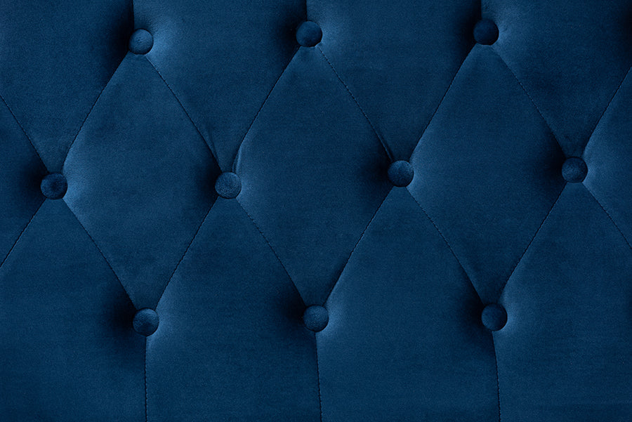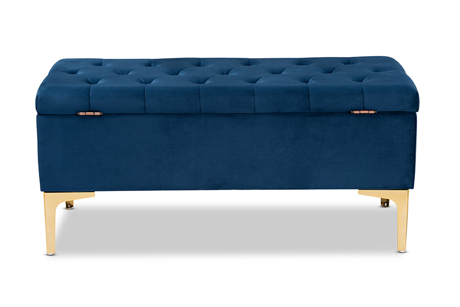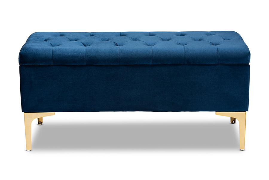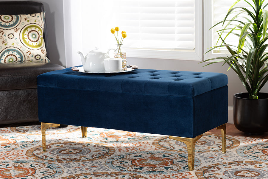 Glamorous seating doubles as practical storage in the Ayu ottoman. Constructed from oak wood, the Ayu is upholstered in a lavish velvet fabric and padded with foam for the utmost sitting comfort. The elegant button tufted top opens to reveal ample storage space, while gold-tone legs add a striking look. The Ayu is well suited for use as a bench in your bedroom or as an accent piece in your living room. The Ayu ottoman is made in China and requires assembly.