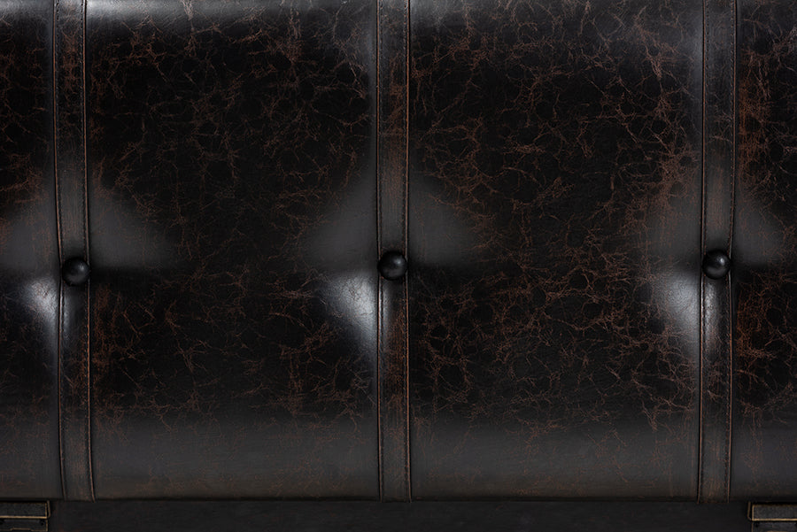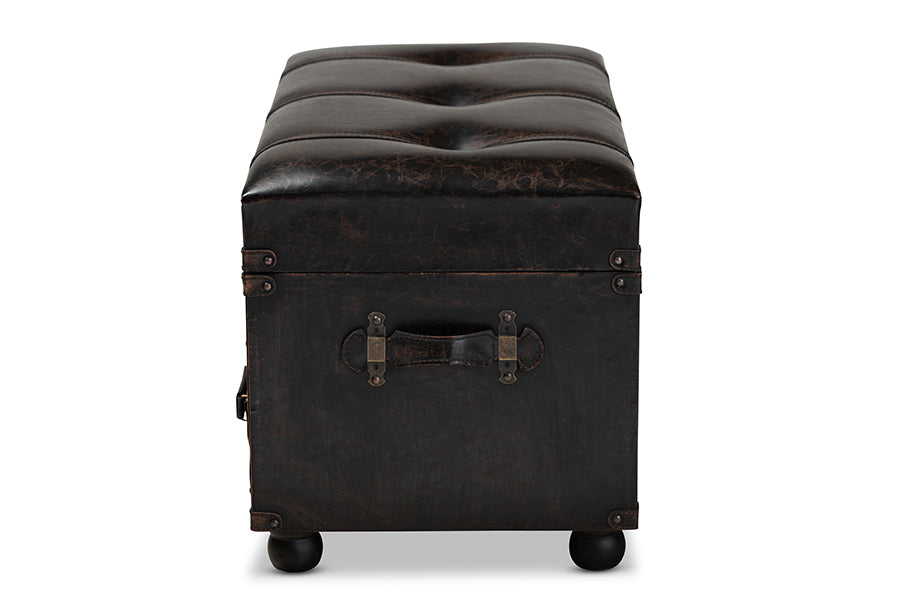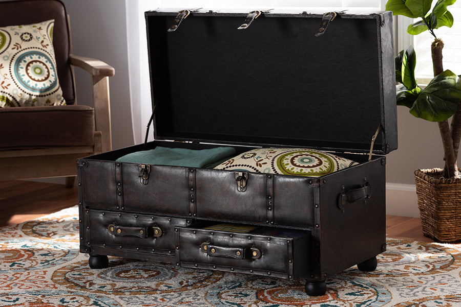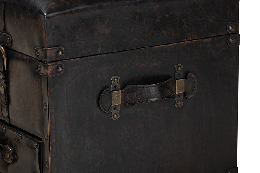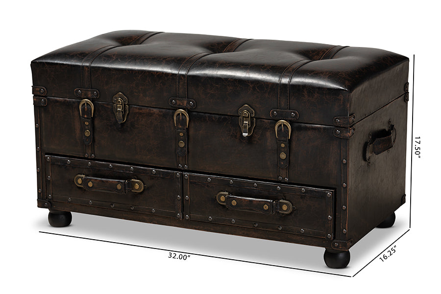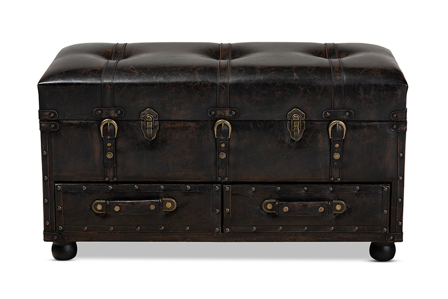 Stylish and versatile, the Lauro ottoman is an easy addition to any space. Set on top of black bun feet, the Lauro is upholstered in a distressed dark brown faux leather for an authentic antique look. Ample storage space is located beneath the cushioned lift-up lid, as well as in two drawers situated at the bottom. Inspired by vintage steamer trunks, the Lauro is accented with antique brass buckles and latches. Antique bronze nailheads and button tufting add an extra dose of style. The Lauro ottoman is made in China and will arrive fully assembled.