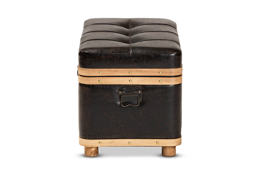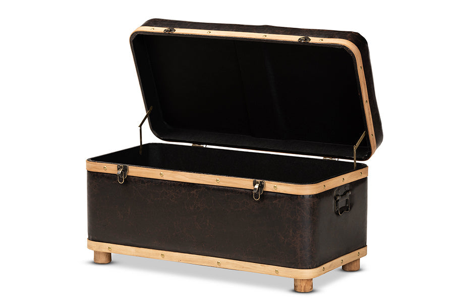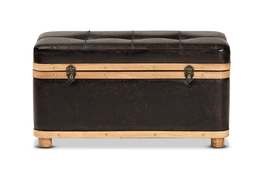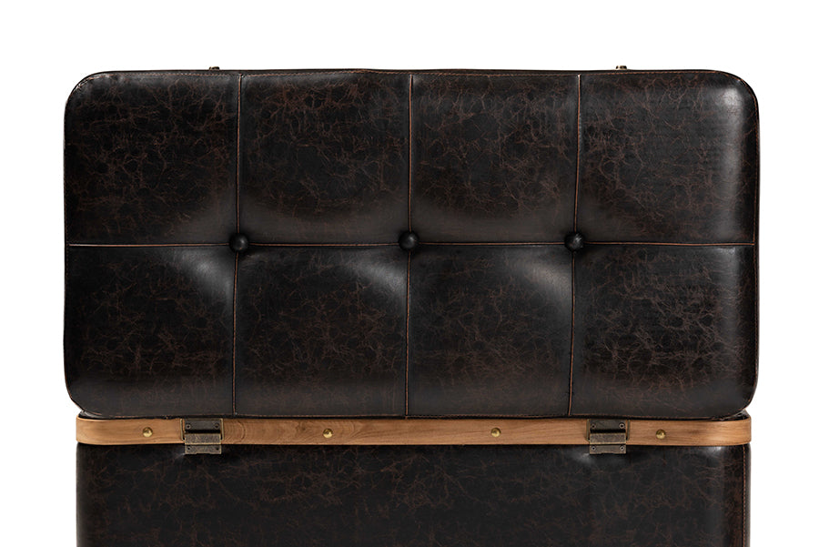 The Leora storage ottoman blends rustic design with modern utility to organize your space in striking style. Made in China, this ottoman is comprised of a sturdy wood frame upholstered in distressed dark brown faux leather. Its button tufted cushion is padded with plush foam to serve as a cozy footstool or as extra seating when needed. Fully assembled, its top lifts open to reveal spacious storage for blankets, pillows, and more. Oak brown finished wood bands lined with brass finished metal studs lend a contemporary touch that complements the dark upholstery. Ornate antique brass finished handles and latches complete the look, making the Leora ottoman an outstanding solution to your storage needs.
