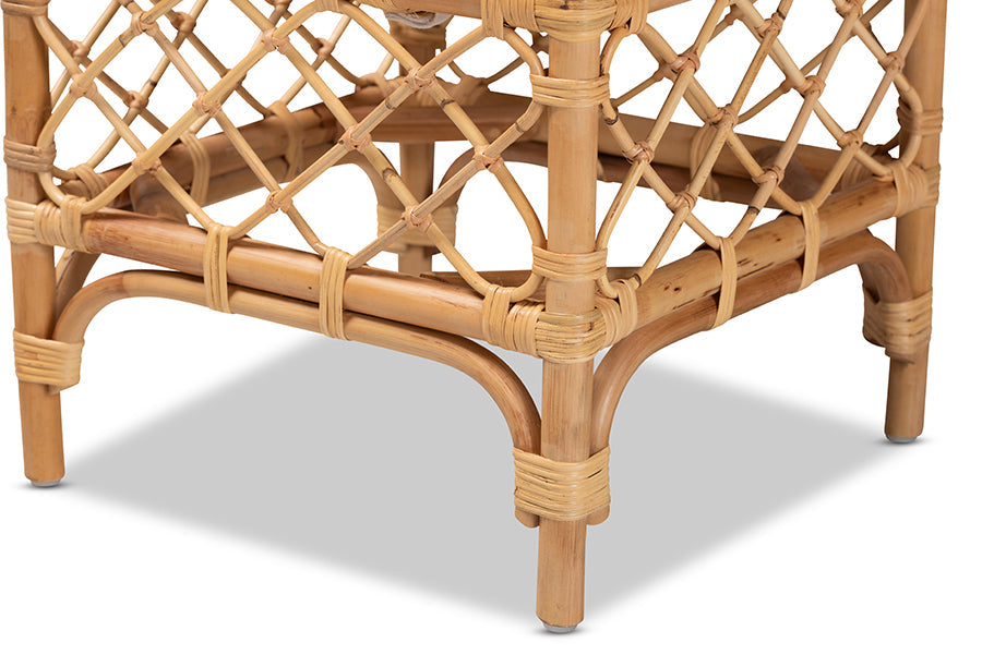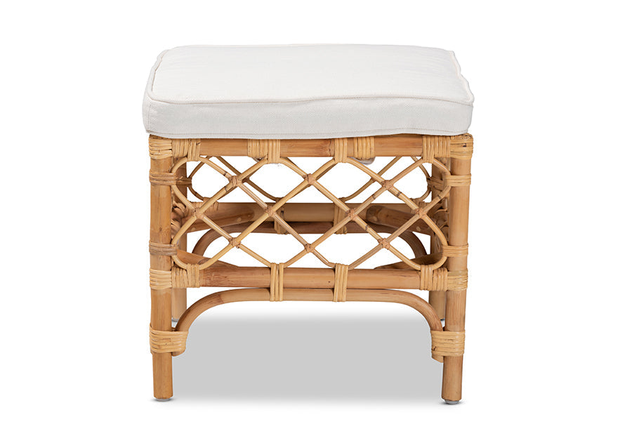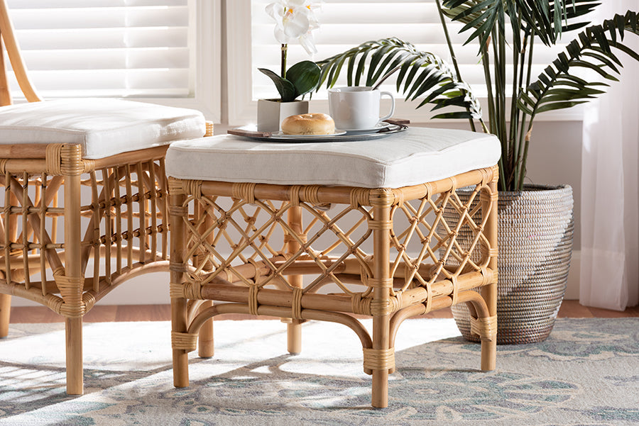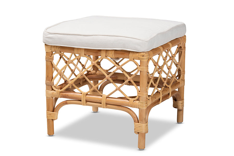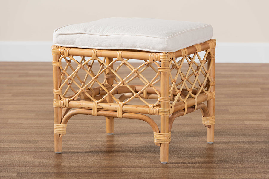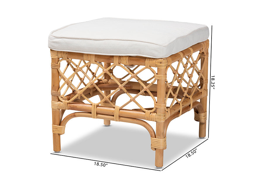 Endow your space with the serene comfort and refreshing design of the Jacinda ottoman. Made in Indonesia, this accent piece is comprised of a natural rattan frame adorned with woven embellishments. Its plush seat features a cushion padded with layers of foam and upholstered in smooth fabric for superb comfort. The Jacinda will arrive fully assembled and utilizes an intricate, openwork frame that allows light to flow naturally throughout the room. Offering lavish comfort in a petite yet charming design, the Jacinda ottoman completes the layout of any space.