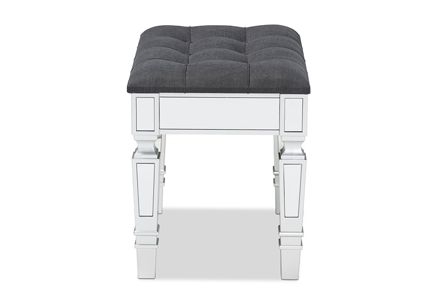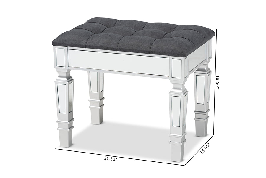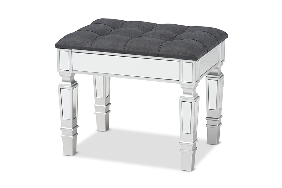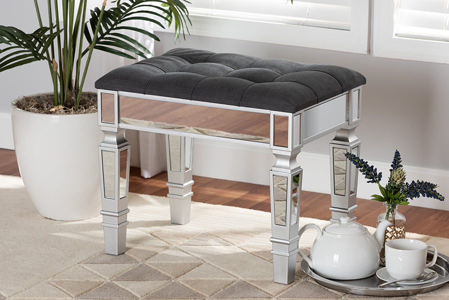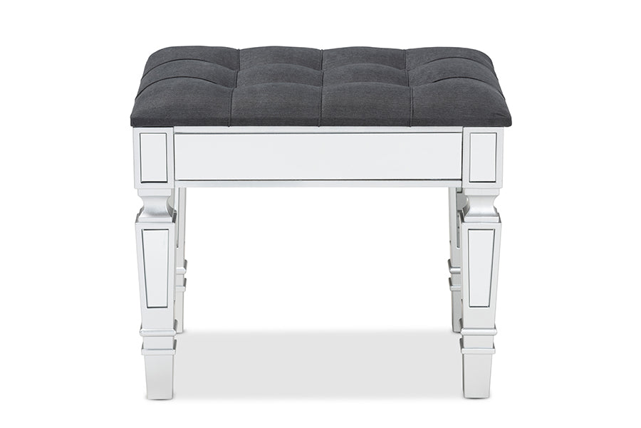 Exhibit an air of grandeur in your space with the refined elegance of the Oren ottoman. Made in China, this stunning piece is comprised of a solid wood frame fitted with mirrored glass panels for an extraordinary display. Its seat features a plush, foam-padded cushion upholstered in fabric showcasing a classic button-tufted design for a beautiful blend of form and function. The Oren requires assembly and utilizes tapered legs for excellent stability and support while forming a sleek silhouette. Introducing modern grace to any room layout, the Oren ottoman enhances the feel of any space.
