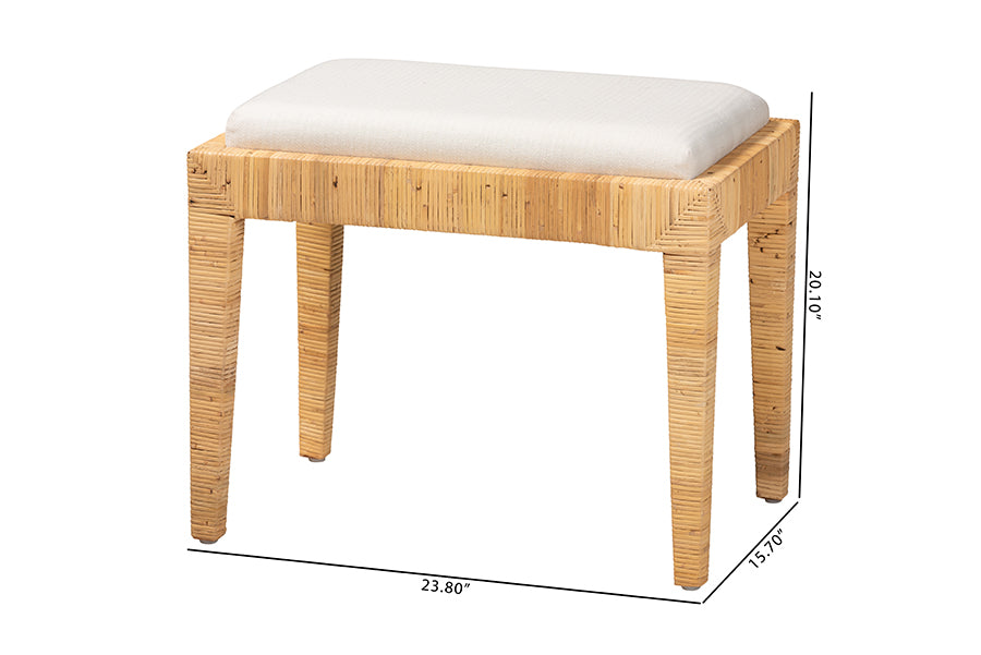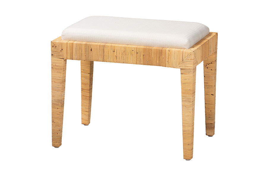 Elevate the atmosphere of any arrangement with the boho flair of the Lumines ottoman. Handmade in Indonesia, this chic piece consists of a solid mahogany wood frame enveloped in natural rattan for a relaxed, tropical look. The Lumines will arrive fully assembled and is padded with plush foam and upholstered in soft fabric for a cozy embrace. Tapered legs lend a modern outline, making the Lumines ottoman an injection of Bohemian flair to any layout.
