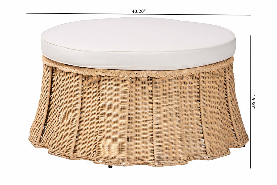 Product Dimensions: Overall Ottoman Dimensions: 40.20" W x 40.20" D x 16.50" H; Seat(w/o removable cushion): 34.60" W x 34.60" D x 16.50" H(from floor);Handwoven Rattan : Elegantly arranged natural rattan adds coastal charm with a light airy aestheticDurable Construction : Constructed from Natural Rattan and Metal Pleated Skirt Design : The elegantly shaped frame arranged with woven rattan gives the illusion of folded fabric Braided Detailing : A braided rattan band distinguishes the piece with intricate geometric flair Removable Cushion : Padded with plush foam and upholstered in sumptuous fabric Fully Assembled : This cocktail ottoman arrives ready for use Set Includes: One (1) Ottoman