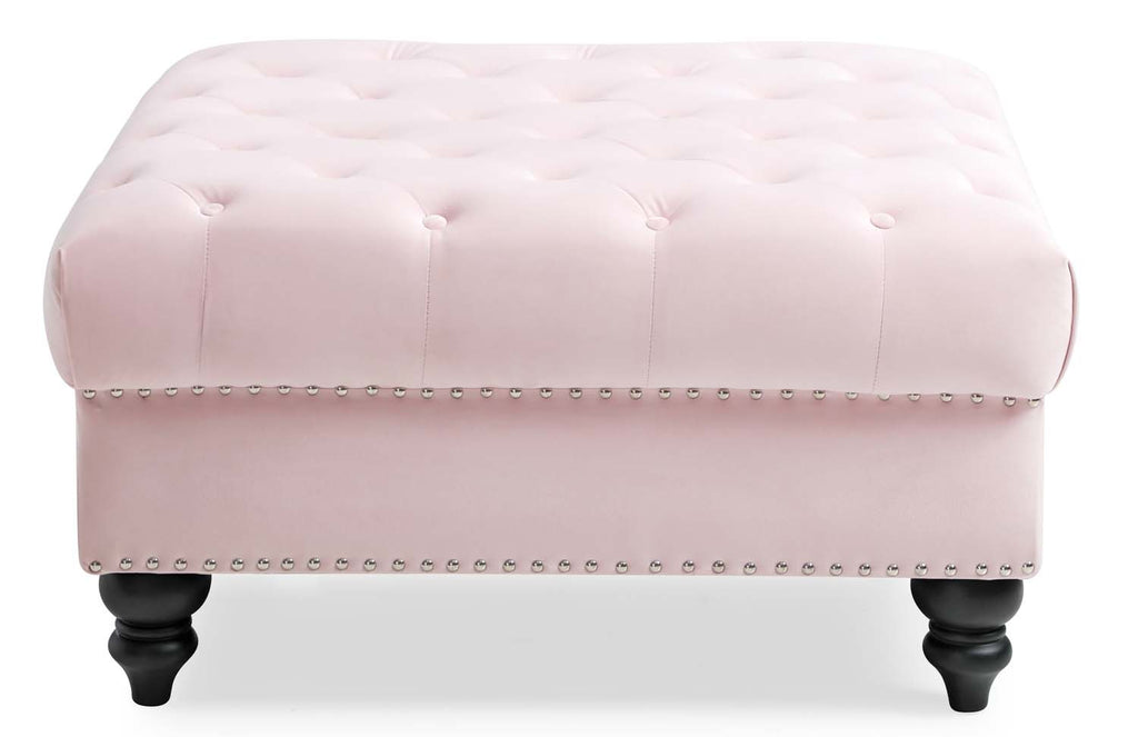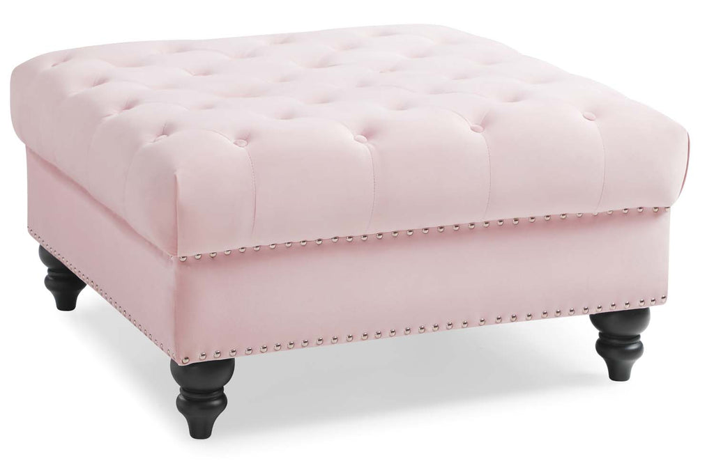 Jumbo Tufted Ottoman covered in Soft Plush Velvet. Chrome Nailheads and Wood Legs with Brass Paint Accents finish off this Classic look.