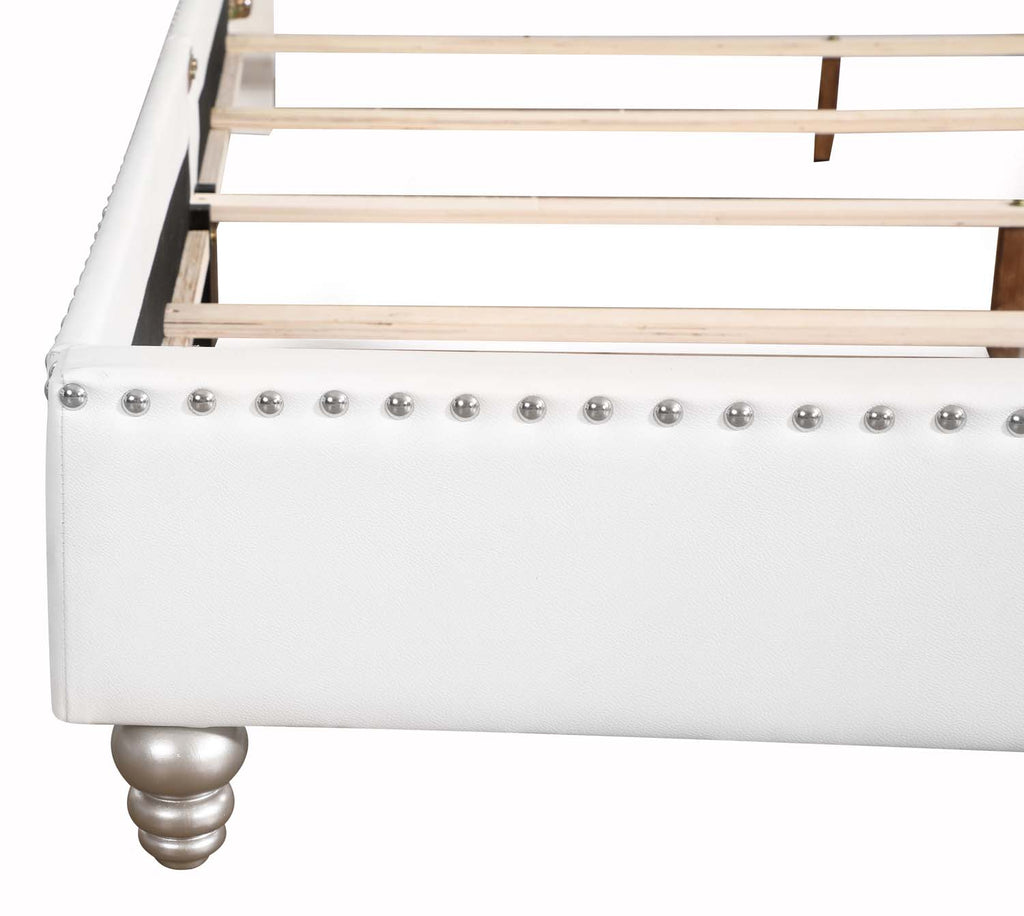 Deep tufting, Nailhead Trim Painted Feet and Scroll Top Padded Headboard Sets this Bed Apart . Choose from Velvet Like Micro Suede or Faux Leather. Available in a choice of Sizes From Full to King . Requires use of BoxSpring or Foundation