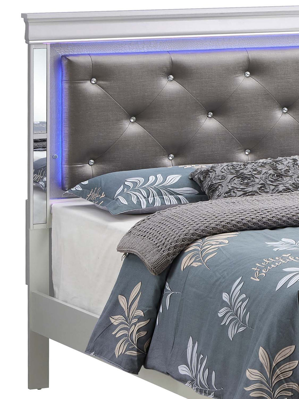 This bed blends modern flair with elegant detailing, creating a standout piece that elevates any bedroom. The diamond-tufted upholstered headboard adds a touch of sophistication, enhanced by soft built-in LED lighting that provides a gentle ambient glow. Mirrored accents frame the headboard for an added touch of refinement, while the footboard features a stylish lattice-pattern panel that brings texture and visual interest. Designed with durability and style in mind, this bed offers dependable support and a polished, contemporary look that suits a wide range of interiors.