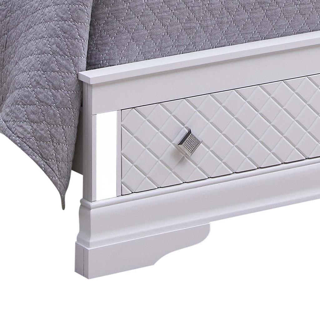 This bed brings together modern elegance and everyday functionality, creating a refined centerpiece for any bedroom. The upholstered, diamond-tufted headboard offers a plush and inviting look, enhanced by soft built-in LED lighting that adds a subtle ambient glow. Mirrored side accents elevate the design with a touch of contemporary sophistication. The footboard includes convenient storage drawers featuring a stylish lattice pattern and sleek hardware, making it easy to keep essentials organized while maintaining a clean, polished aesthetic. Built with a sturdy frame and attention to detail, this bed blends comfort, style, and practicality in one seamless design.