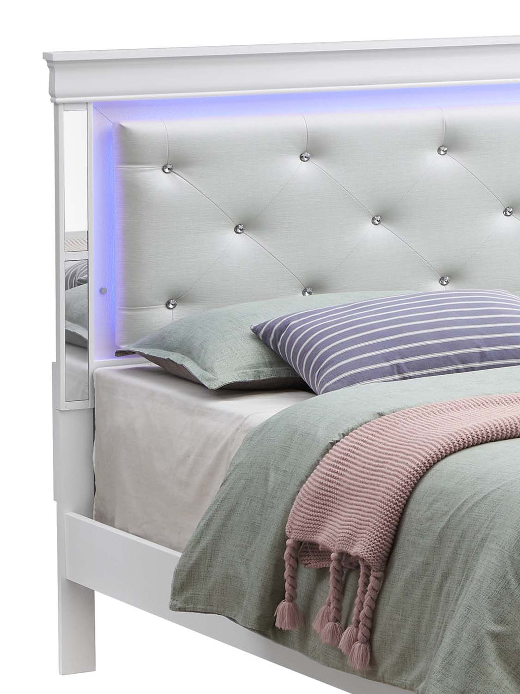 This bed blends contemporary style with subtle luxury, creating a standout centerpiece for any bedroom. The upholstered, diamond-tufted headboard adds a refined and comfortable touch, while built-in LED lighting provides a soft ambient glow that enhances the room’s atmosphere. Mirrored side accents frame the headboard for a sleek, modern finish. The footboard showcases a textured lattice pattern that adds visual interest and a designer feel. Built with a sturdy frame and smooth lines throughout, this bed offers both durability and elevated style, making it an ideal choice for a modern, polished sleeping space.