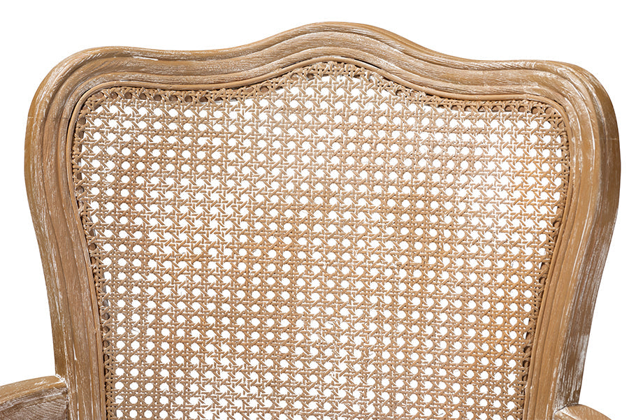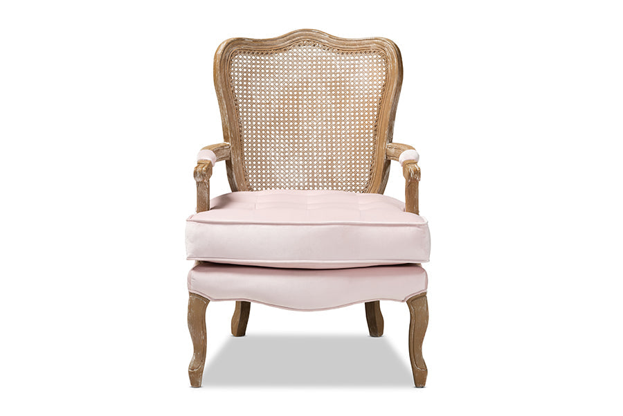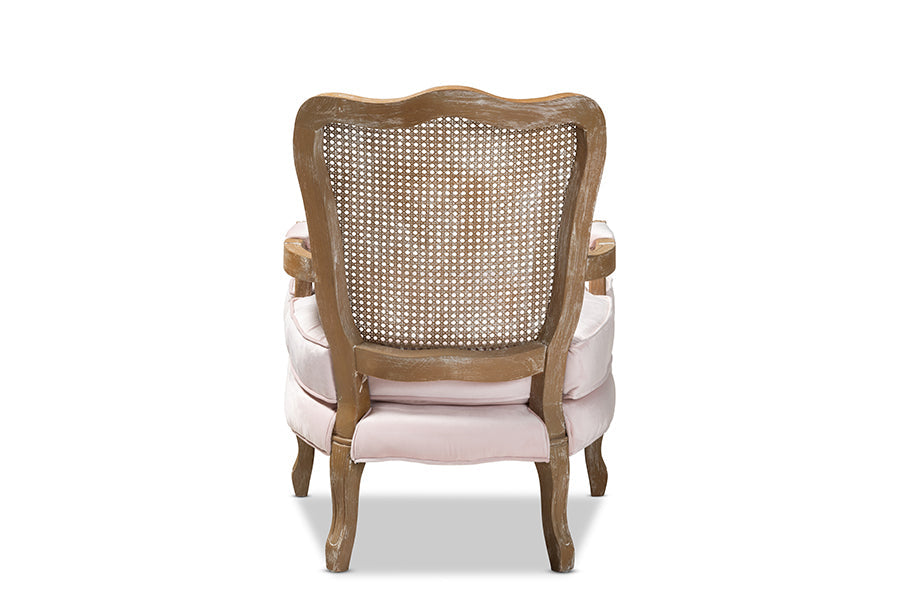 Bring French elegance to your living room with the Arpina armchair. Constructed from solid oak wood, the Arpina showcases a white-washed natural finish for an aged appearance. The armchair is upholstered in a soft, sumptuous velvet fabric and features padded armrests and a thick foam-padded seat for the utmost comfort. Stunning craftsmanship is displayed on the intricately woven bamboo back, as well as the elegant carvings in the wood frame. Charming cabriole legs complete the look. The Arpina armchair is made in China and will arrive fully assembled.