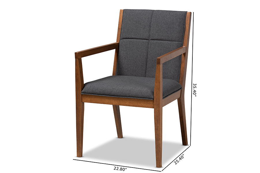 Transform any space with the mid-century modern Miren chair. Made from a solid, walnut finished wood base and topped with soft polyester fabric, the Miren turns any living room, dining room, or busy office into a stylish space. Providing a naturally modern feel, the Miren is made in Malaysia and features angled legs that continue upward to form ergonomic armrests. Square-patterned stitching on the back lends a contemporary look that complements the chair's clean, streamlined silhoutte. The Miren chair is sold as a set of 2 chairs and requires assembly.