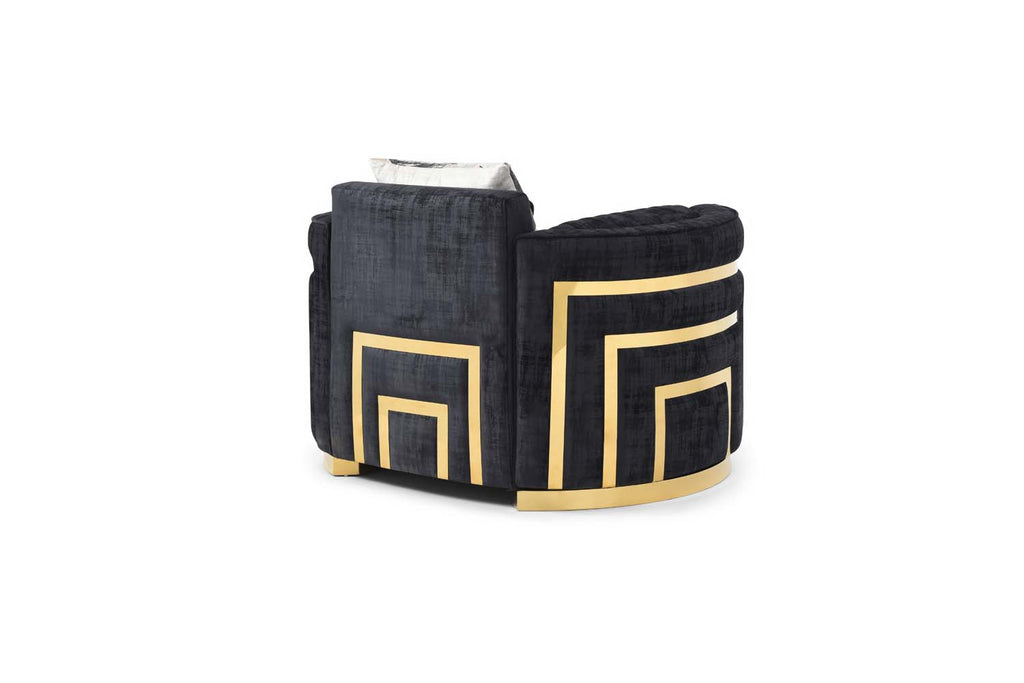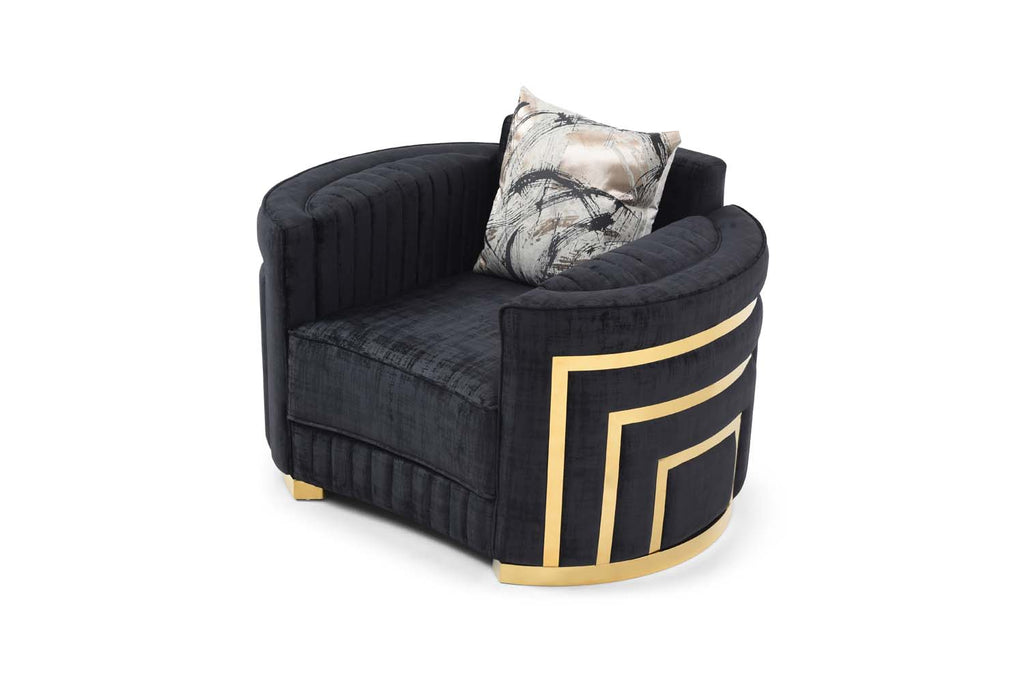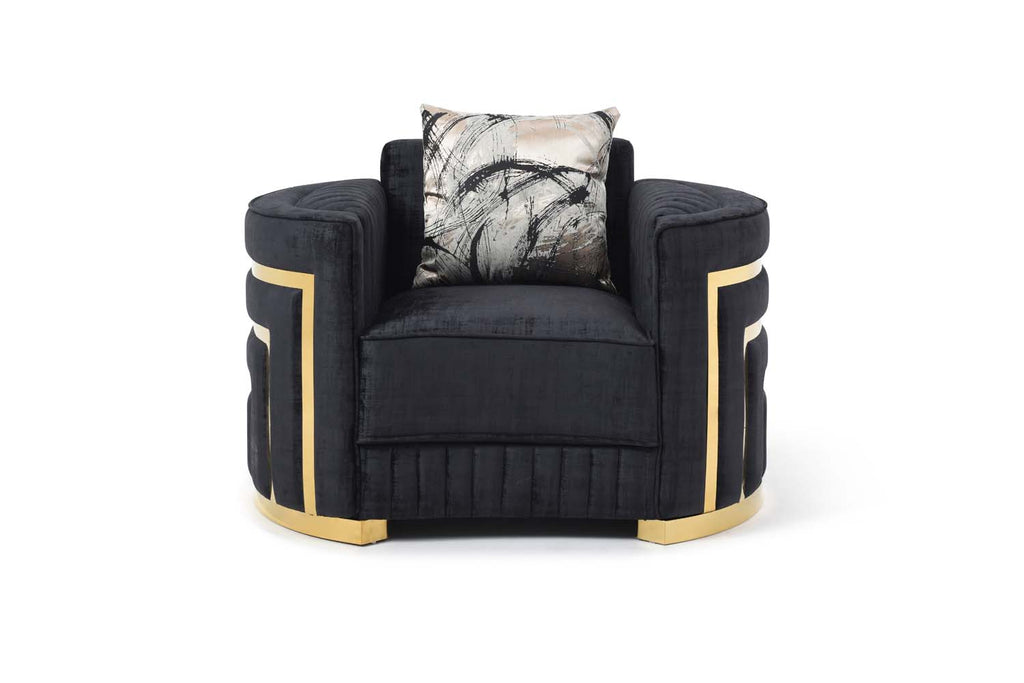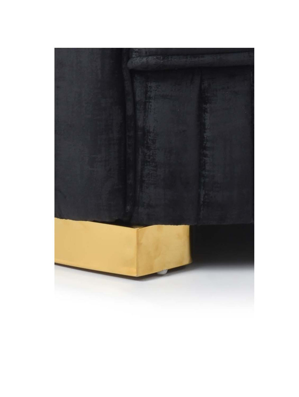 Rich Black upholstery paired with shimmering gold-hued chrome creates a refined, modern centerpiece. Deep 23-inch seat invites lounging while its generous length comfortably sits up to three adults. Durable framework supports plush cushions, offering a dependable spot for daily relaxation. Included contrasting back pillows enhance both visual appeal and overall support. Curved silhouette gives the sofa a distinctive profile that anchors contemporary spaces. Pillows, legs, and hardware arrive securely inside the base for quick, convenient setup.