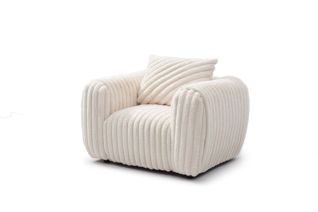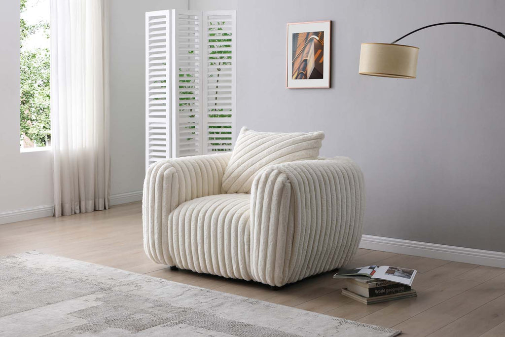 Features a soft white boucle fabric that feels refined and adds an inviting tone to any living space. Overall dimensions are well-suited for open rooms, offering versatility and comfort. Solid construction and plush cushions ensure strong support and a relaxing seating experience. Back pillows are filled to maintain loft, offering lasting comfort and minimal fluffing required. Generously sized seat and back cushions provide supportive seating for family or guests.