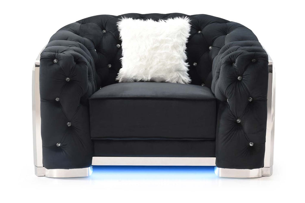 This accent chair elevates any room with its luxurious tufted design and sculpted silhouette. Deep cushioning along the back, arms, and seat creates an inviting place to unwind, while the detailed crystal-style tufting adds a touch of glamour. A modern, sleek base enhances the overall statement look, complete with an under-glow effect that adds ambient lighting and a contemporary edge. Perfect for living rooms, lounges, or upscale bedroom seating, this piece blends comfort with high-end style effortlessly.
