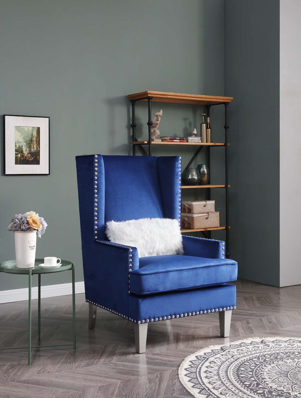 This elegant wingback accent chair elevates any room with its tall, sculpted silhouette and plush velvet upholstery. Shimmering nailhead trim outlines the arms, wings, and base, adding a refined touch of glamour. Supported by sleek tapered legs and finished with a soft faux-fur lumbar pillow, it offers both comfort and statement-making style.