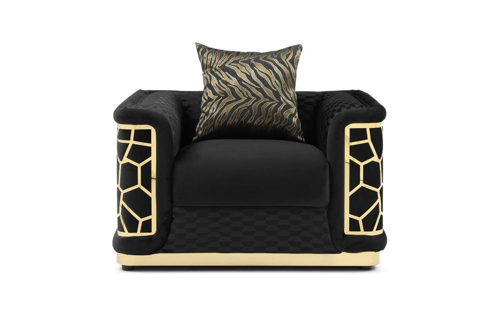 This modern accent chair makes a bold statement with its sculptural silhouette and luxurious velvet upholstery. The geometric gold trim wraps around the arms and base, adding a sleek designer touch, while the textured side panels create visual depth. Finished with a plush seat cushion and a patterned throw pillow, it delivers comfort and contemporary flair in one striking piece.