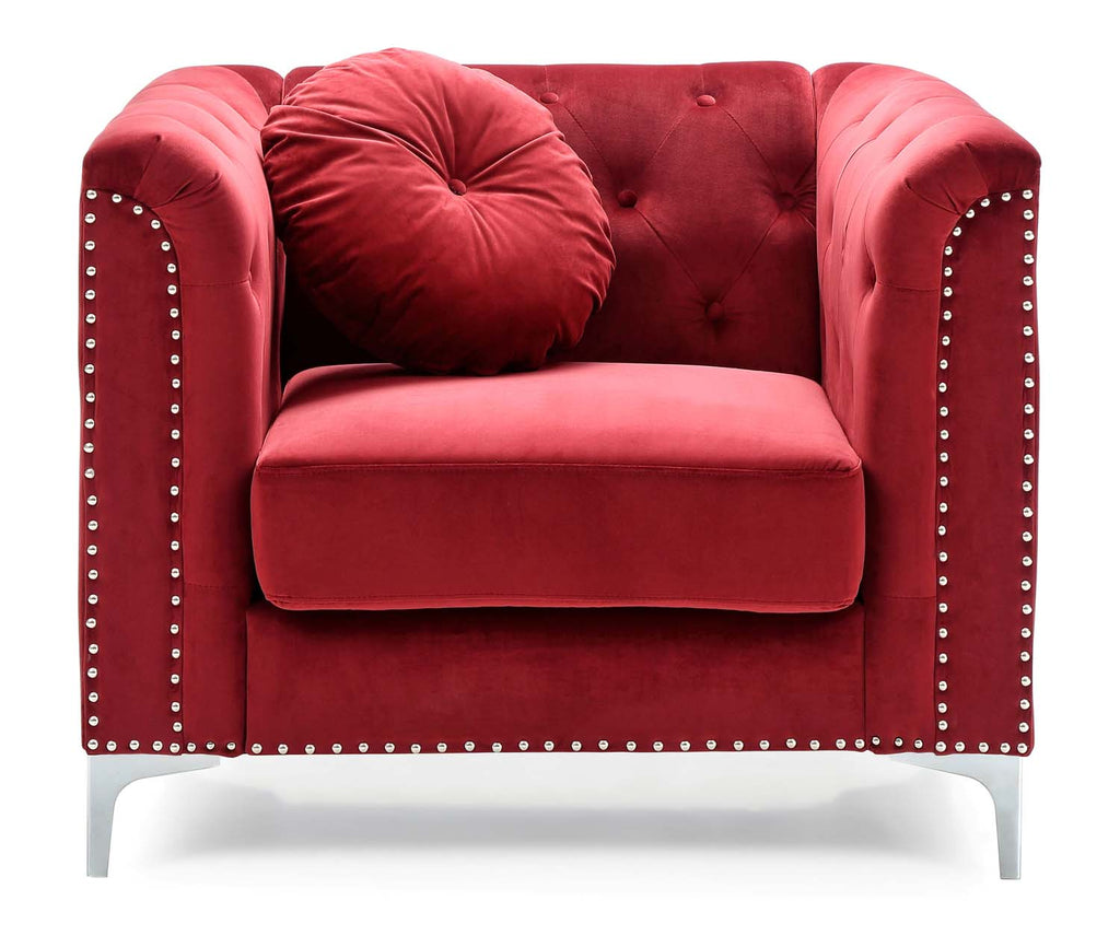 Soft Velvet Button Tufted on the Inside of the Arms and Backs. Pocketed Coil Cushion Seats Make this Set Comfortable and Stylish. Nailhead trimmed and finished off with Chrome Plated Legs , It also includes Round Matching Throw Pillows. KD Design allows for easy Delivery to any Home or Room! Choose from Sofa. Loveseat Chair Or Reversible Chaise Sectional