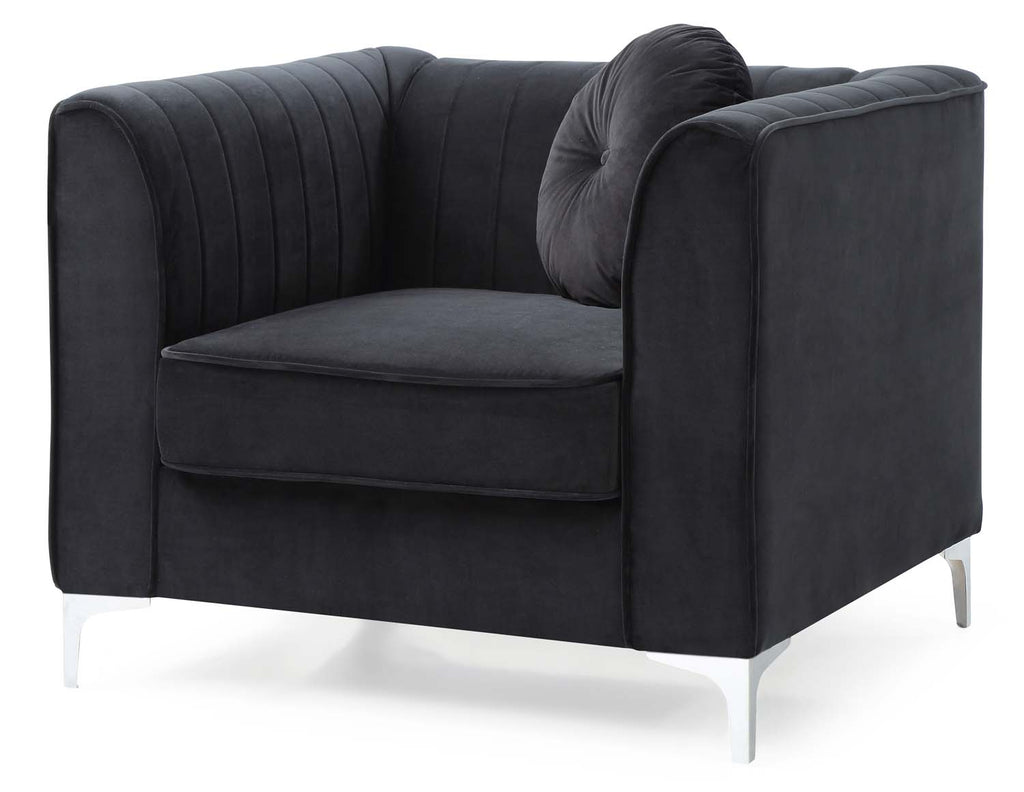 Soft Velvet Channel Tufted on the Inside of the Arms and Backs. Pocketed Coil Cushion Seats Make this Set Comfortable and Stylish. Chrome Nailhead trimmed and finished off with Chrome Plated Legs , It also includes Round Matching Throw Pillows. KD Design allows for easy Delivery to any Home or Room! Choose from Sofa. Loveseat Chair Or Reversible Chaise Sectional