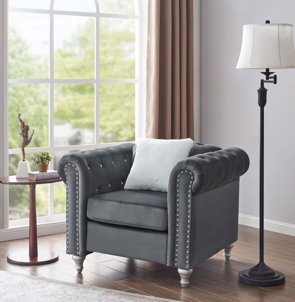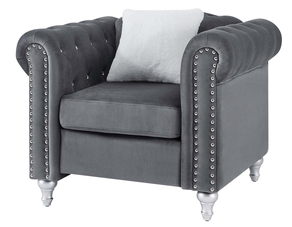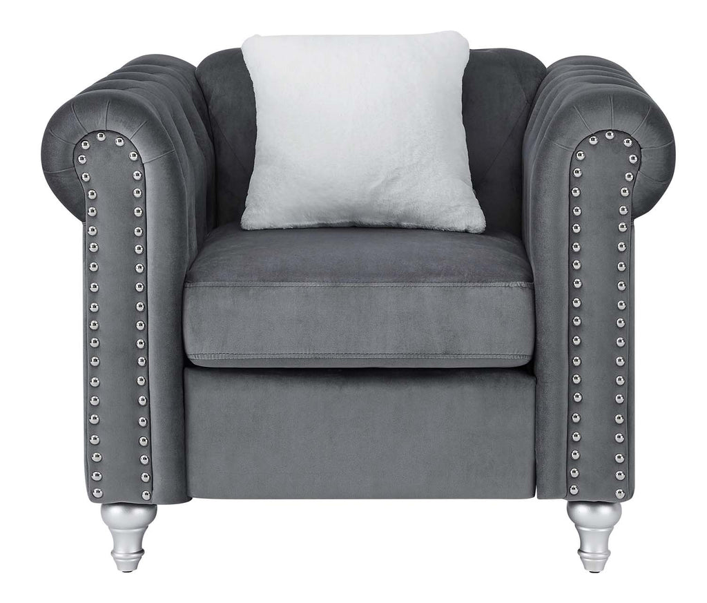 Updated Version of the Classic Chesterfield Design. Soft Micro Suede Velvet Cover is Tufted with Faux Jewels and set off with Chrome Nailheads for a Stunning Look. Pocketed Coil Seats assure you of Long Lasting Comfort. Contrasting Throw Pillow Finishes off this Group