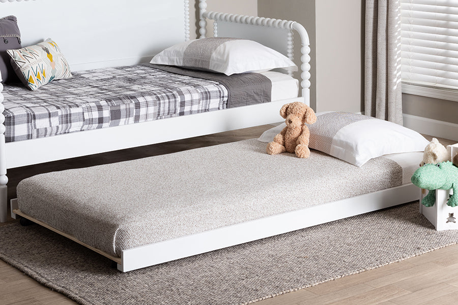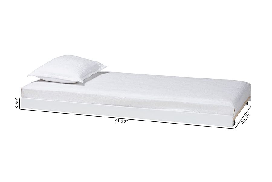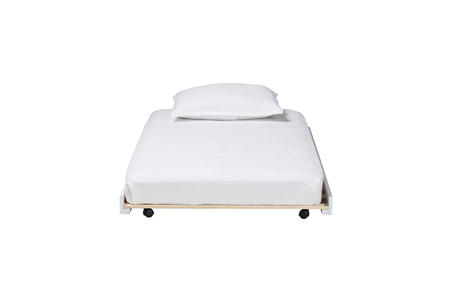 The efficient artistry of the Laverne trundle contributes to an environment of traditional flair in your space. Made in Malaysia, this mid-century inspired piece is crafted from sturdy wood. Its low, minimalist border creates a sleek display that heightens existing bedroom arrangements. The Laverne requires assembly and utilizes wood slats for mattress support, eliminating the need for a box spring. Fitted with wheels to swiftly enhance any sleeping arrangement, the Laverne trundle is a wonderful addition to any bedroom or guestroom.
