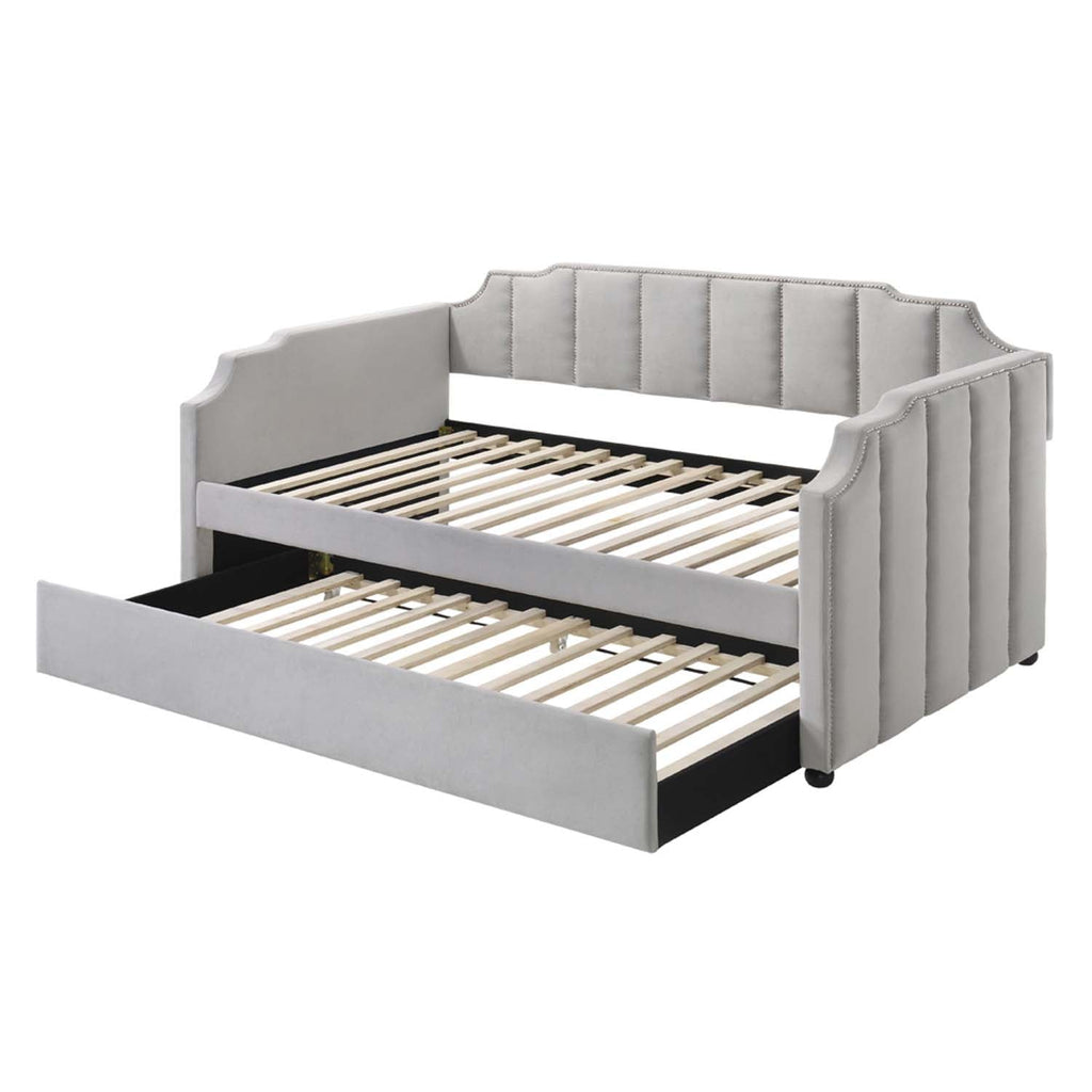 The Peridot traditional vintage upholstered daybed with trundle brings relaxed elegance and comfort to your home. It is crafted with engineered wood and thick foam padding around the frame for added comfort. The smooth velvet upholstery features horizontal tufting, nailhead trim, and an arched frame gives a tailored look.