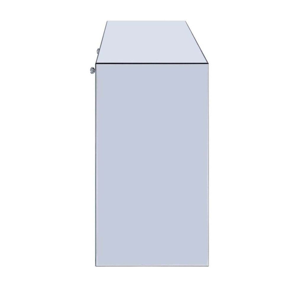 The Noralie Vanity Desk will give any room a touch of glamour. This contemporary desk is fully mirrored with a stunning mirror top and a faux diamond inlay on each leg of its sled base. Use this unique vanity desk for make-up application, jewelry, or as a small writing desk. Two large drawers provide ample and convenient storage for makeup brushes, jewelry, and more.