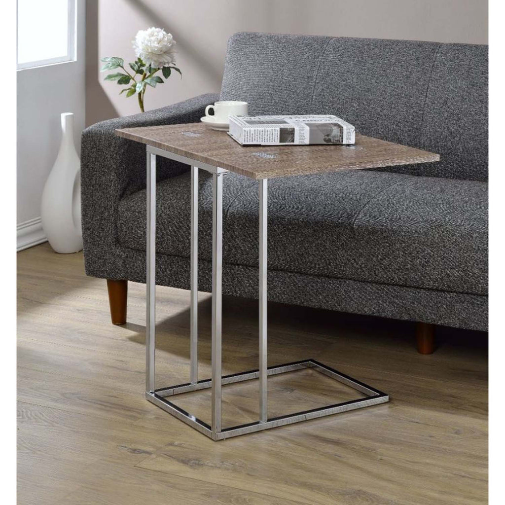 The Denson side table is a perfect addition to any living room with its stylish chrome base and weathered oak top. A bonus feature to an already functional table is the top and its ability to expand from 12" to 18". The expandable top allows for the table to be used as a place to rest a cup of coffee, a dinner setting for those movie nights, or even to work from home.