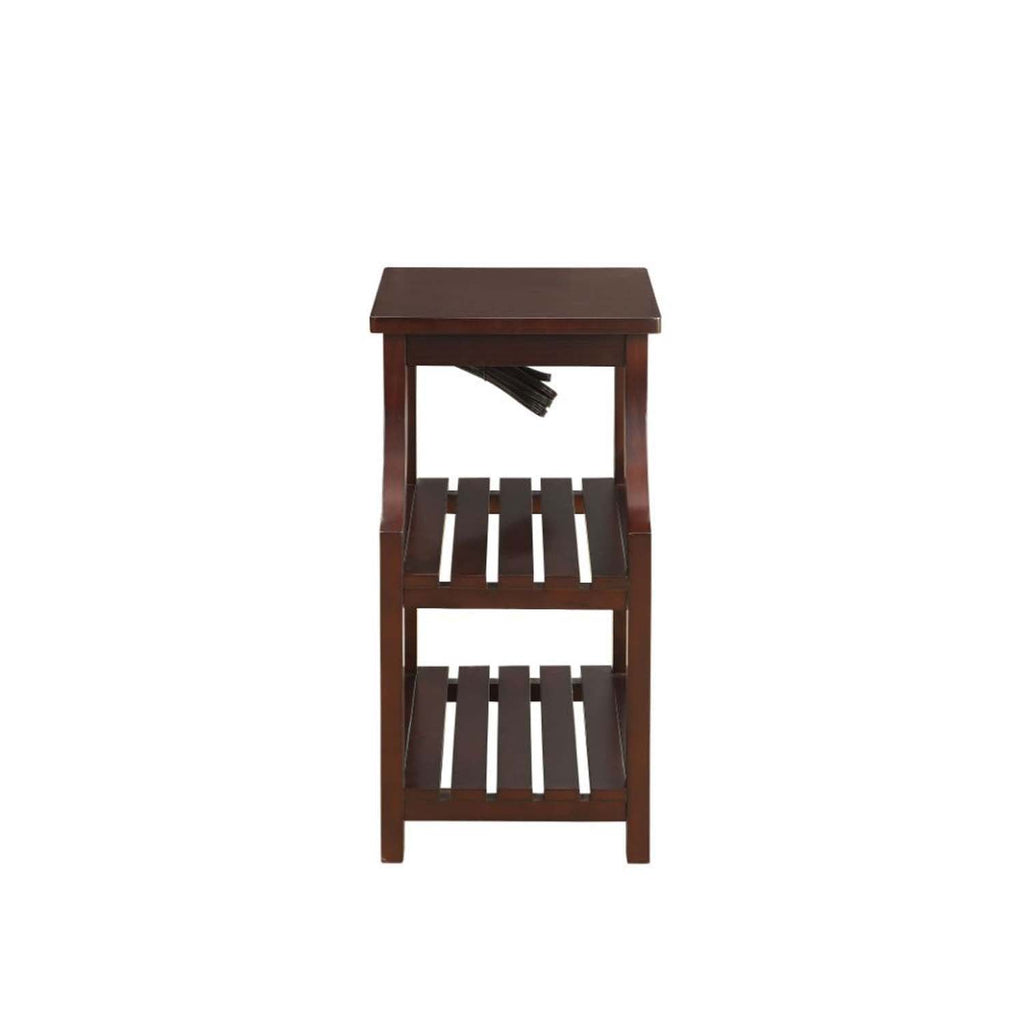 The Wasaki side table will be a great addition to your sofa collection with its sweeping front posts and slatted shelves for storage. The smaller top allows for easy access to the middle shelf. The two slat shelves is the perfect place to showcase your books, baskets or favorite accent pieces.