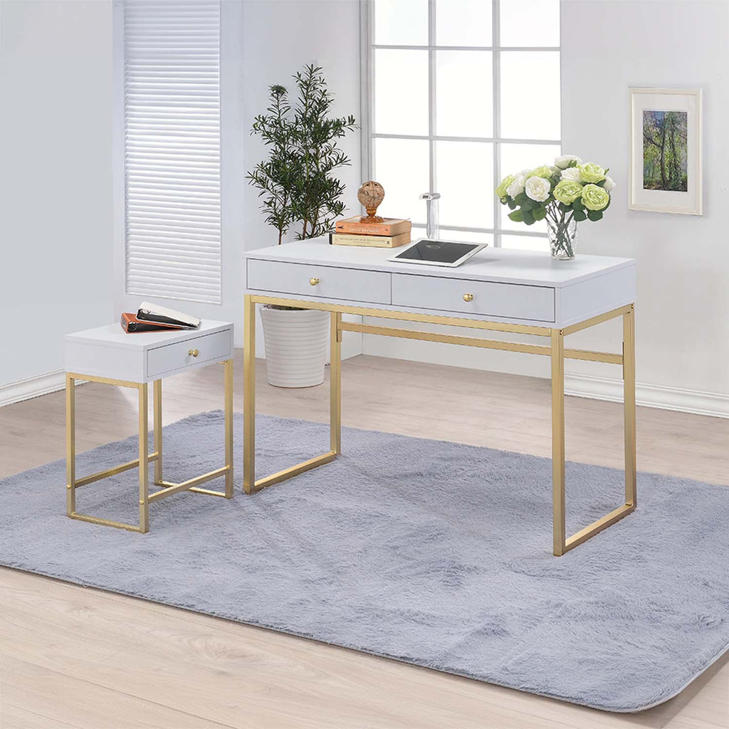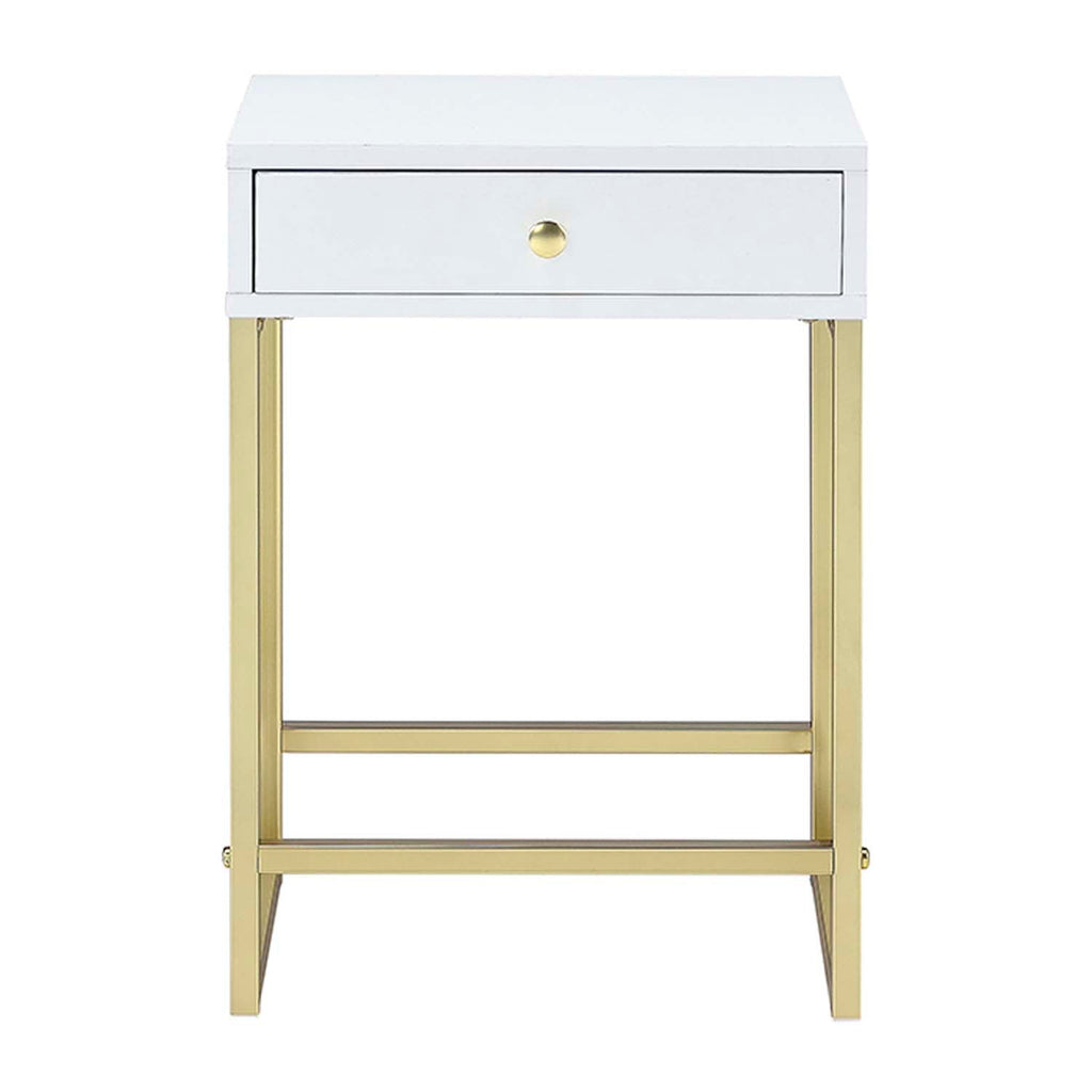 Bring the trending contemporary style into your home with this updated Coleen side table. This side table comes with a drawer providing you an additional space to storage. With featuring white top and brass base, this accent piece will be an elegant piece for any decor. Measures 16" x 12" x 22"H. Drawer with side metal glide.