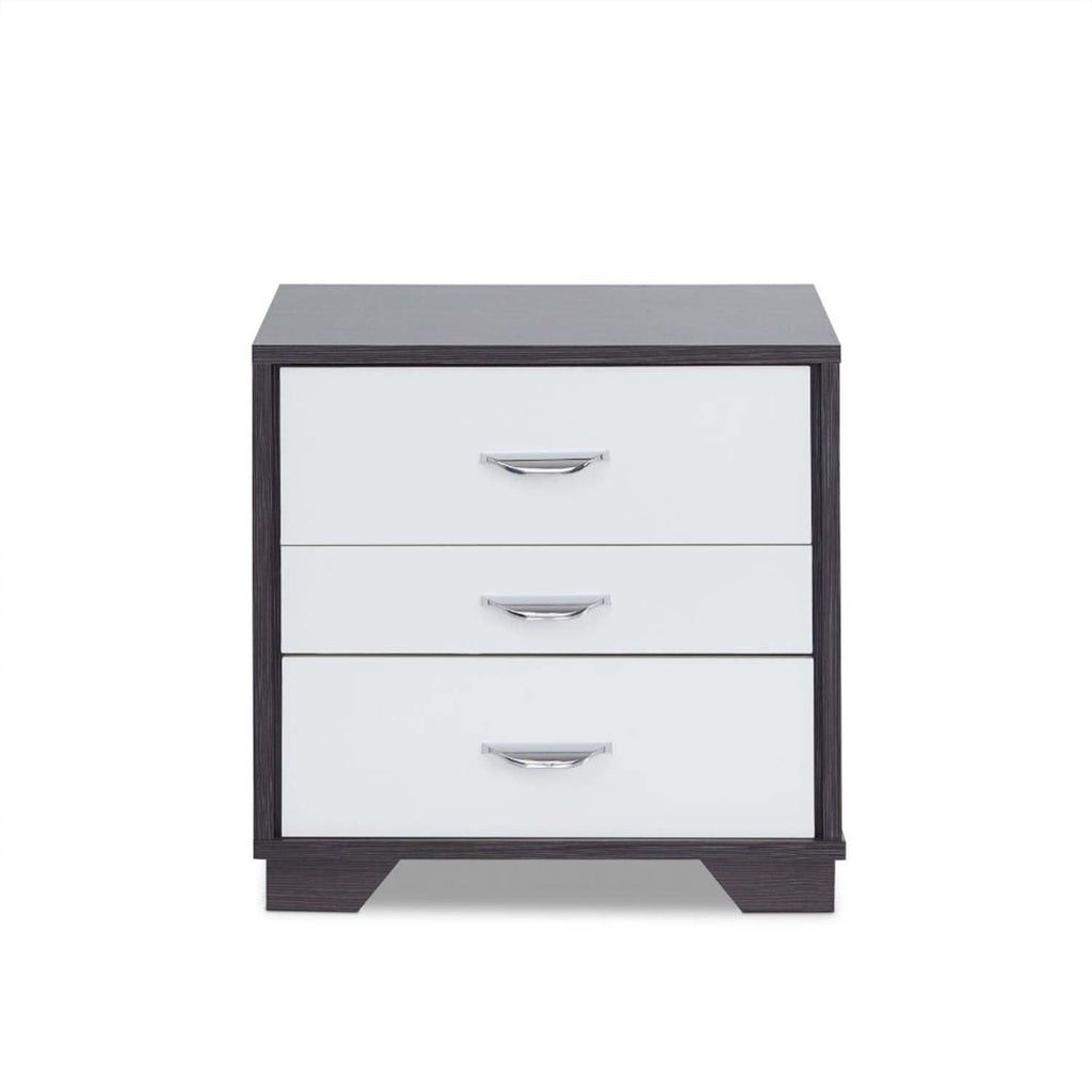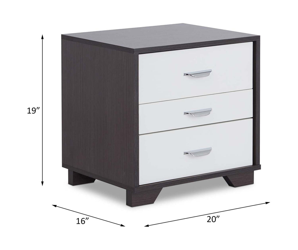 Modern and functional, the Eloy nightstand with easy metal glider runner will be a great addition to your bedroom or living room. Using a combination of espresso and white, this space-saving bedside table gives you three full-size drawers, each perfect for storing the odds and ends out of sight. This collection will work perfect as either nightstand or end table.