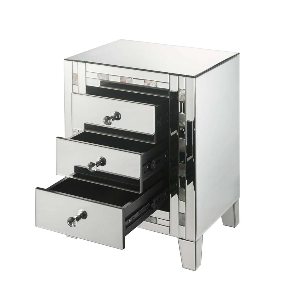 Style and storage abound in the pretty and practical design of the Nasa Side Table. Three drawers offer plentiful enclosed storage for remotes, magazines, or any other items you prefer to keep close at hand. Its three drawers boast crystal knobs and framed by mirrored glass panels with mother pearl stones inlay trim.