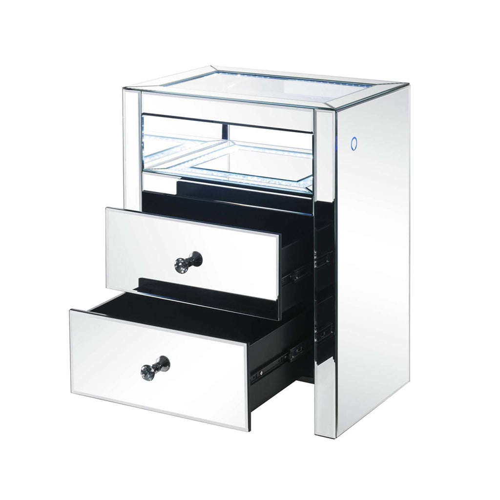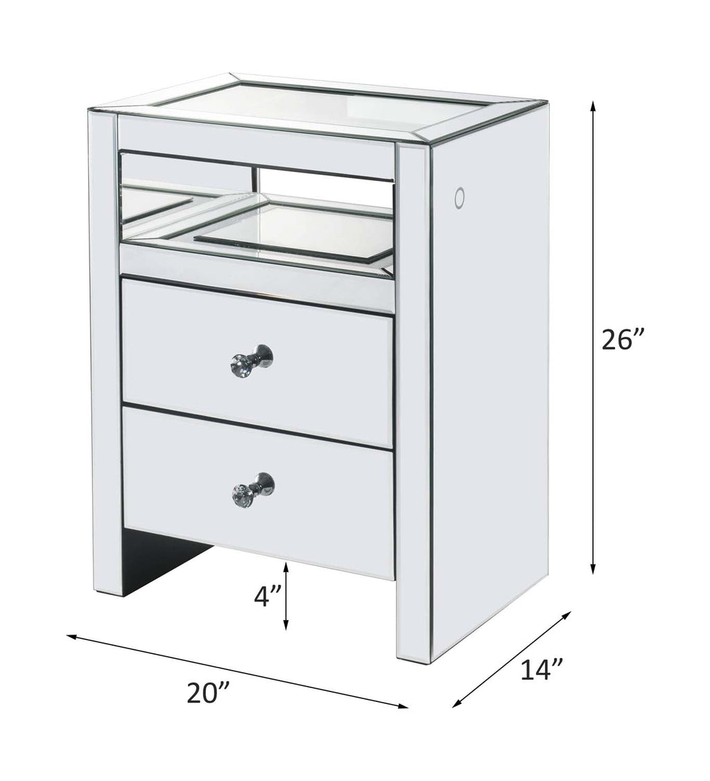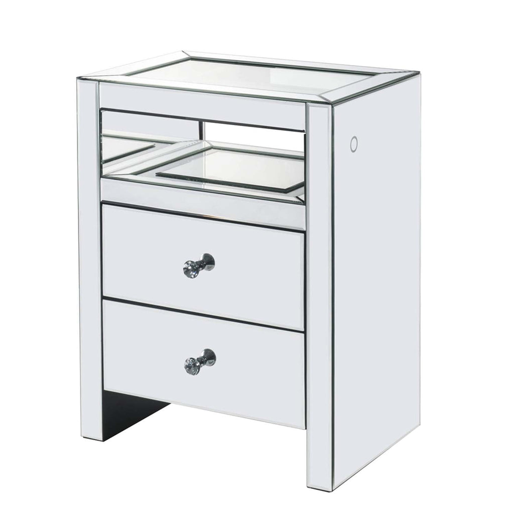 Style and storage abound in the ample and functional design of the Malish occasional table. Two drawers and open compartment offer plentiful enclosed storage for remotes, magazines, or any other items you prefer to keep close at hand. At night, you can turn on and off the LED Function. A glam display table that naturally attracts the eye with its beveled mirrored finish.
